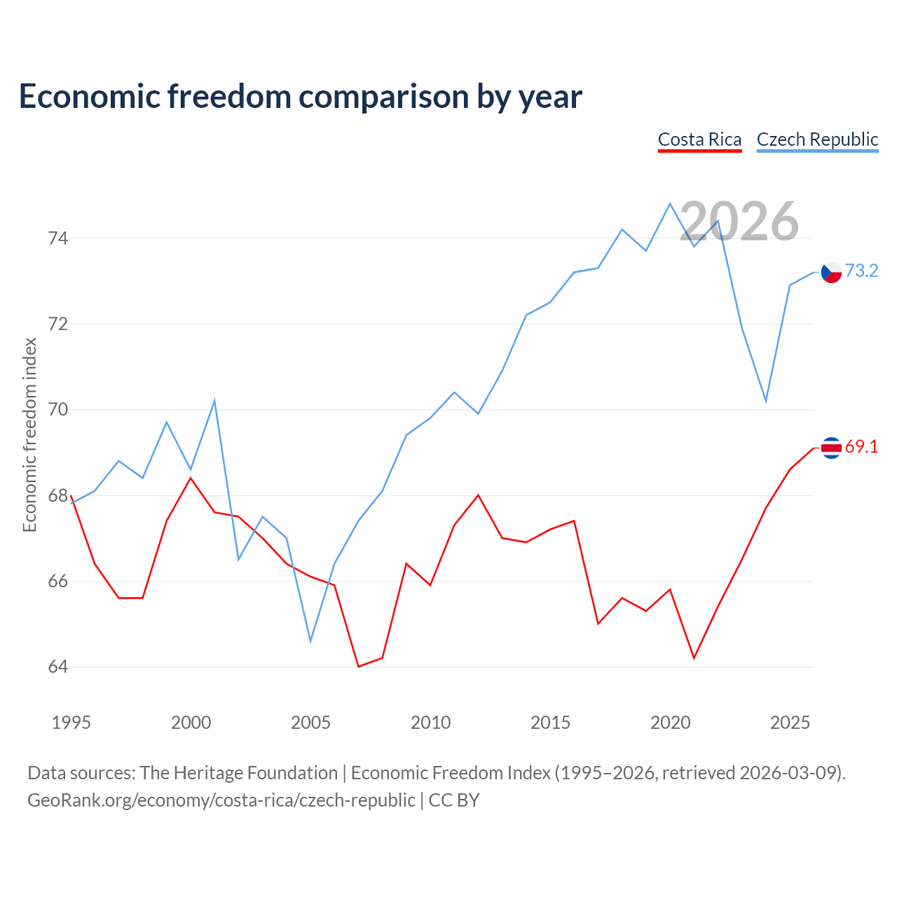 The Economic Freedom Index for Costa Rica is 69.1, ranking 43/197, compared to 73.2 for the Czech Republic, ranking 25/197. The chart above displays a comparison of annual changes in economic freedom indexes.