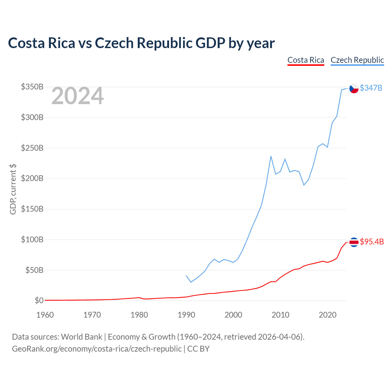 Costa Rica has a GDP of $95.4B compared to $347B for the Czech Republic, ranking 73/197 and 44/197 by economy size, respectively.