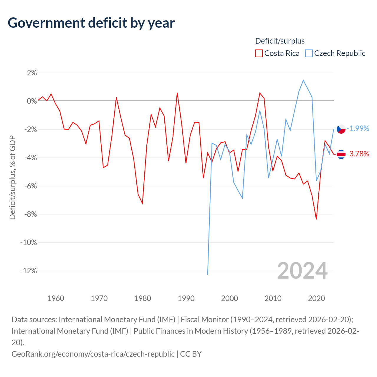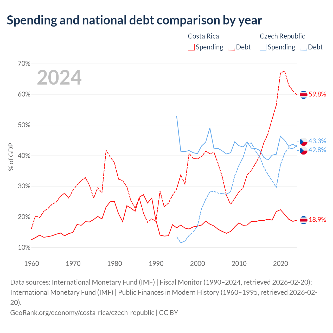 Costa Rica has $57B in government debt (59.8% of GDP), compared to $150B (43.3% of GDP) in the Czech Republic.