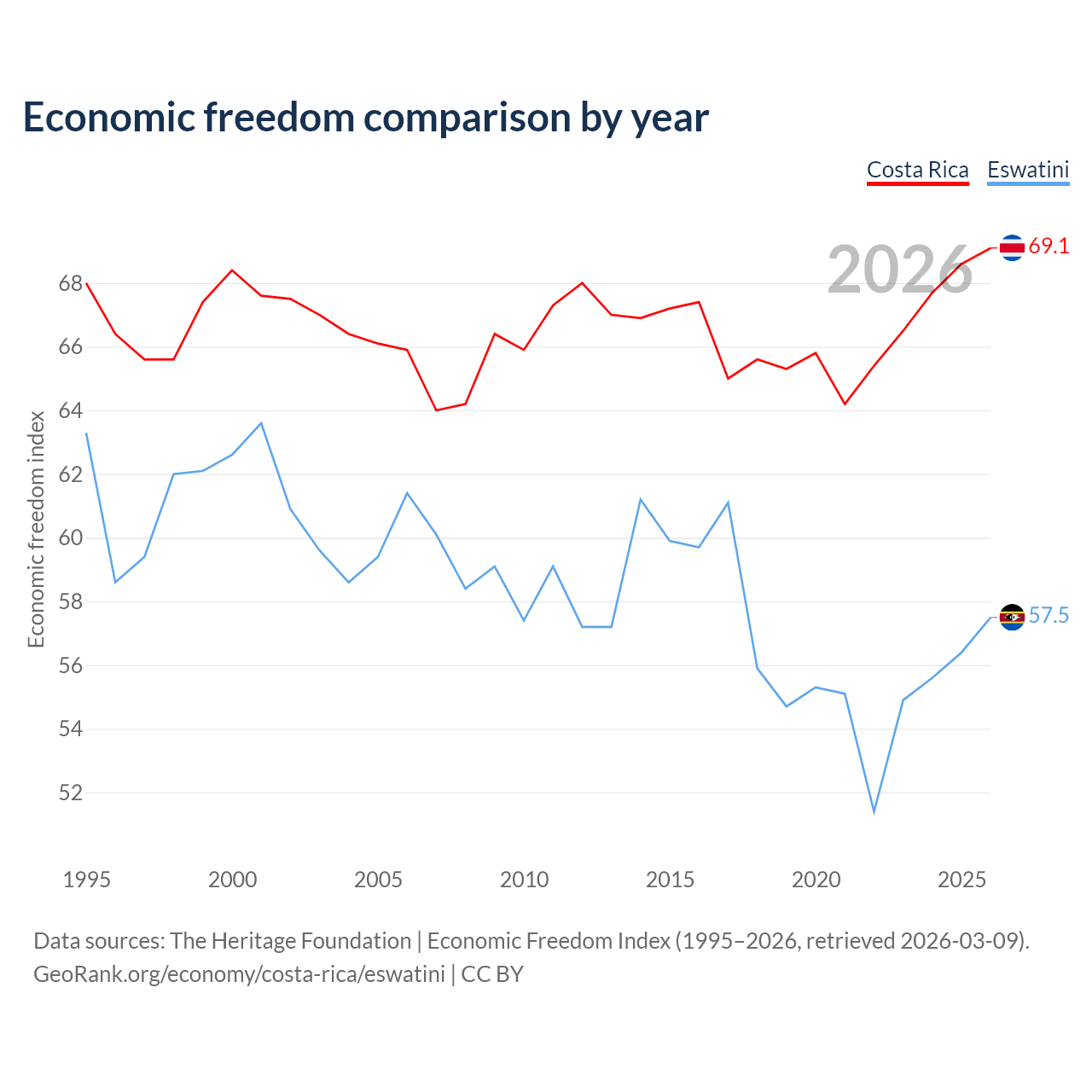 The Economic Freedom Index for Costa Rica is 69.1, ranking 43/197, compared to 57.5 for Eswatini, ranking 116/197. The chart above displays a comparison of annual changes in economic freedom indexes.