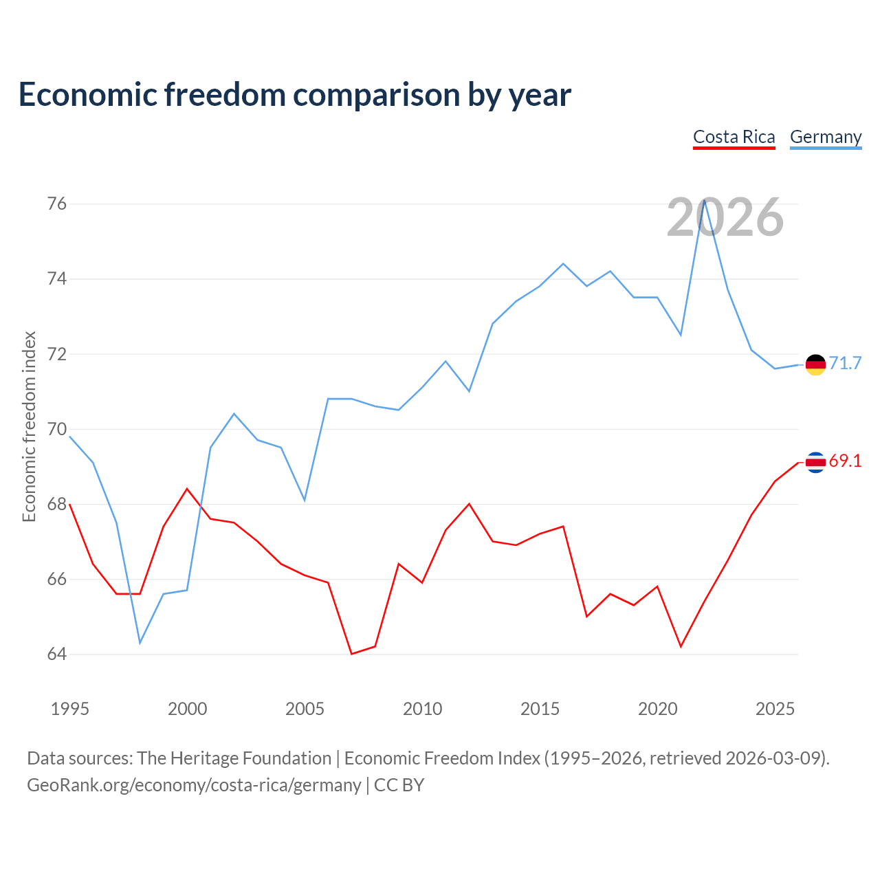 The Economic Freedom Index for Costa Rica is 69.1, ranking 43/197, compared to 71.7 for Germany, ranking 30/197. The chart above displays a comparison of annual changes in economic freedom indexes.