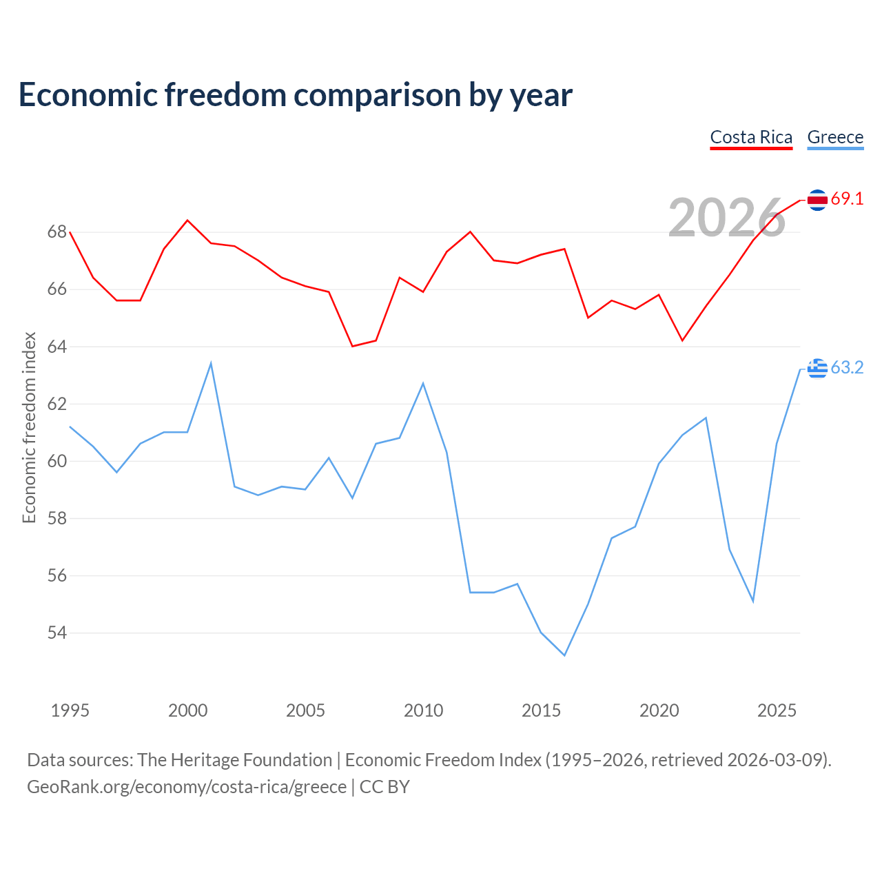 The Economic Freedom Index for Costa Rica is 69.1, ranking 43/197, compared to 63.2 for Greece, ranking 82/197. The chart above displays a comparison of annual changes in economic freedom indexes.