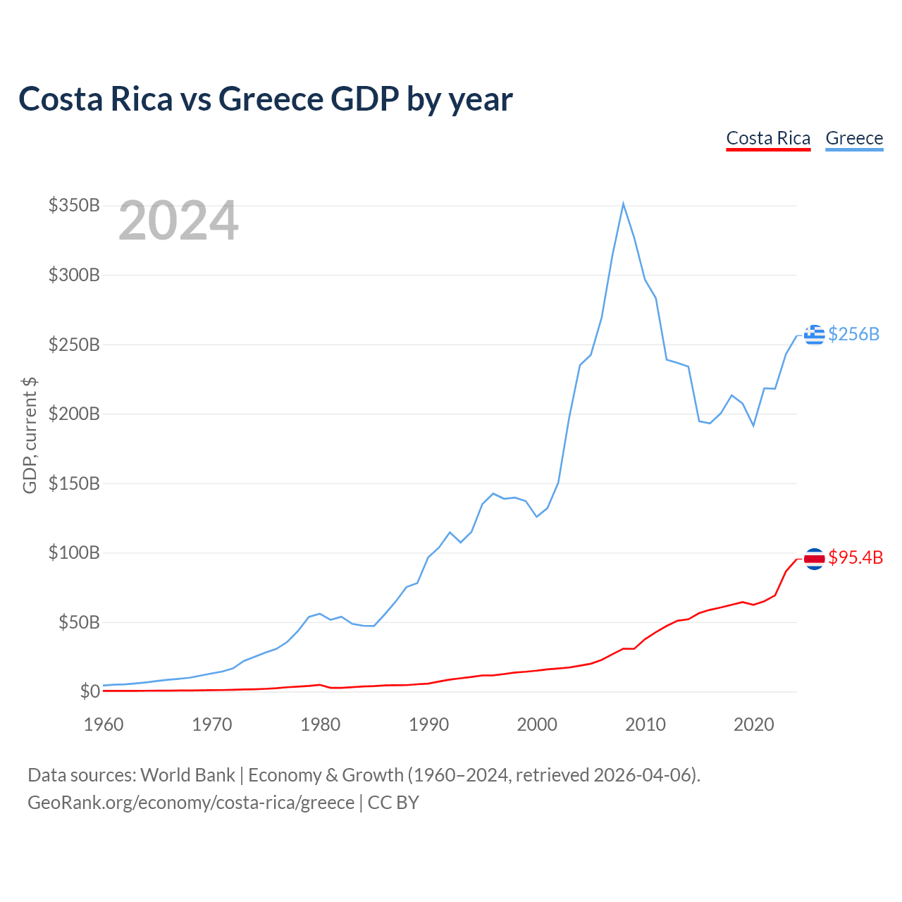 Costa Rica has a GDP of $95.4B compared to $256B for Greece, ranking 73/197 and 53/197 by economy size, respectively.