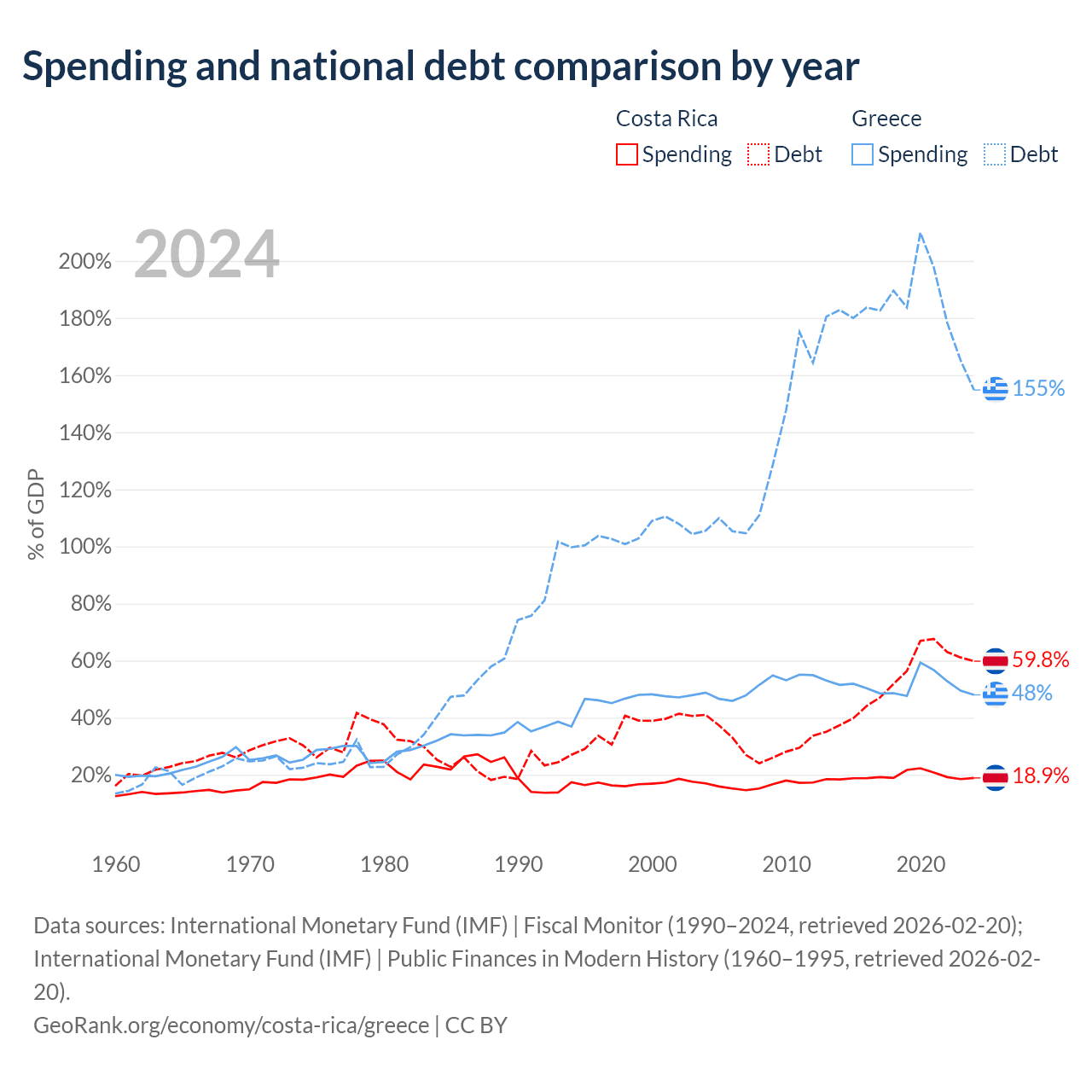 Costa Rica has $57B in government debt (59.8% of GDP), compared to $397B (154.8% of GDP) in Greece.