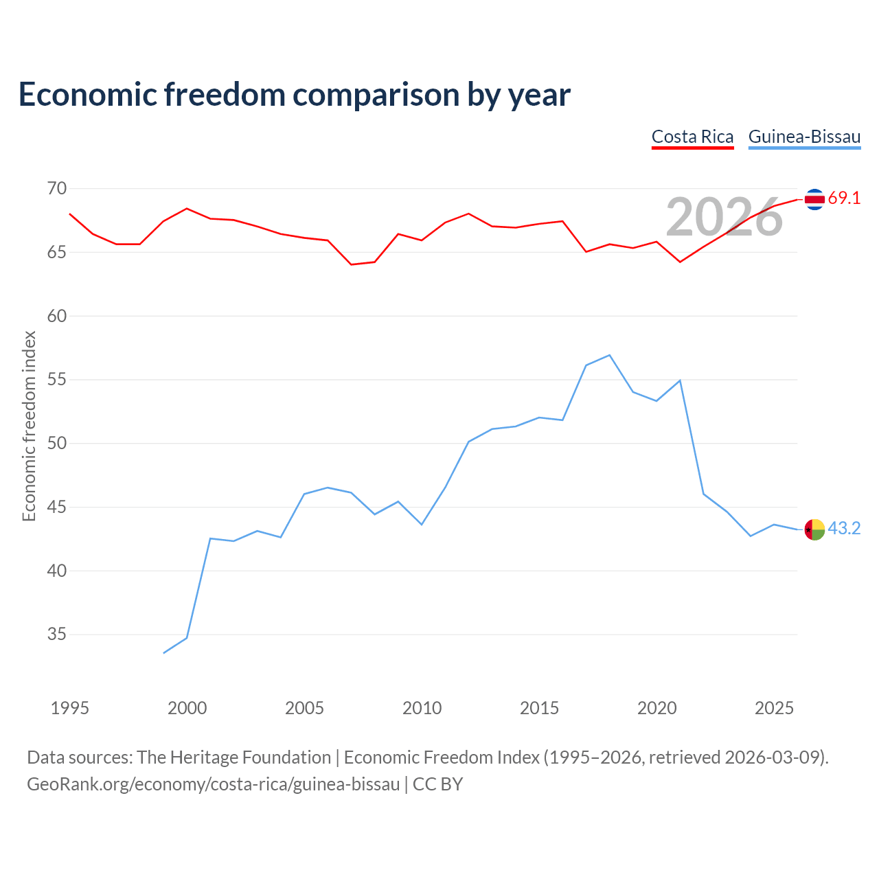 The Economic Freedom Index for Costa Rica is 69.1, ranking 43/197, compared to 43.2 for Guinea-Bissau, ranking 181/197. The chart above displays a comparison of annual changes in economic freedom indexes.