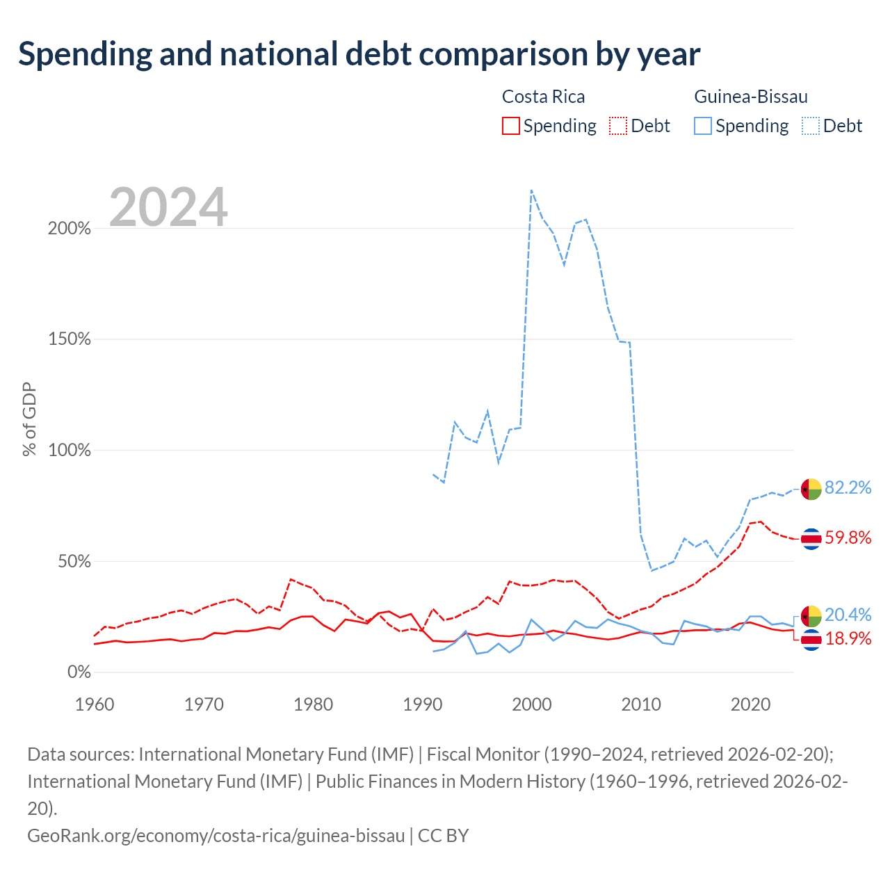 Costa Rica has $57B in government debt (59.8% of GDP), compared to $1.82B (82.2% of GDP) in Guinea-Bissau.