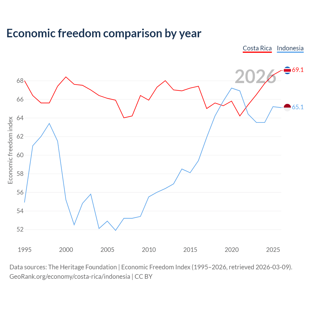 The Economic Freedom Index for Costa Rica is 69.1, ranking 43/197, compared to 65.1 for Indonesia, ranking 67/197. The chart above displays a comparison of annual changes in economic freedom indexes.