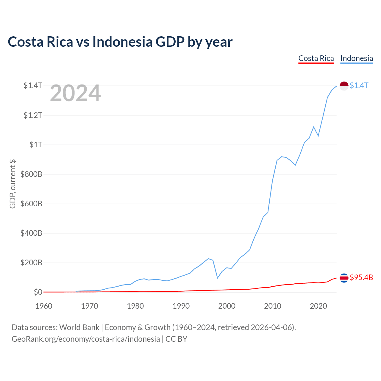 Costa Rica has a GDP of $95.4B compared to $1.4T for Indonesia, ranking 73/197 and 16/197 by economy size, respectively.