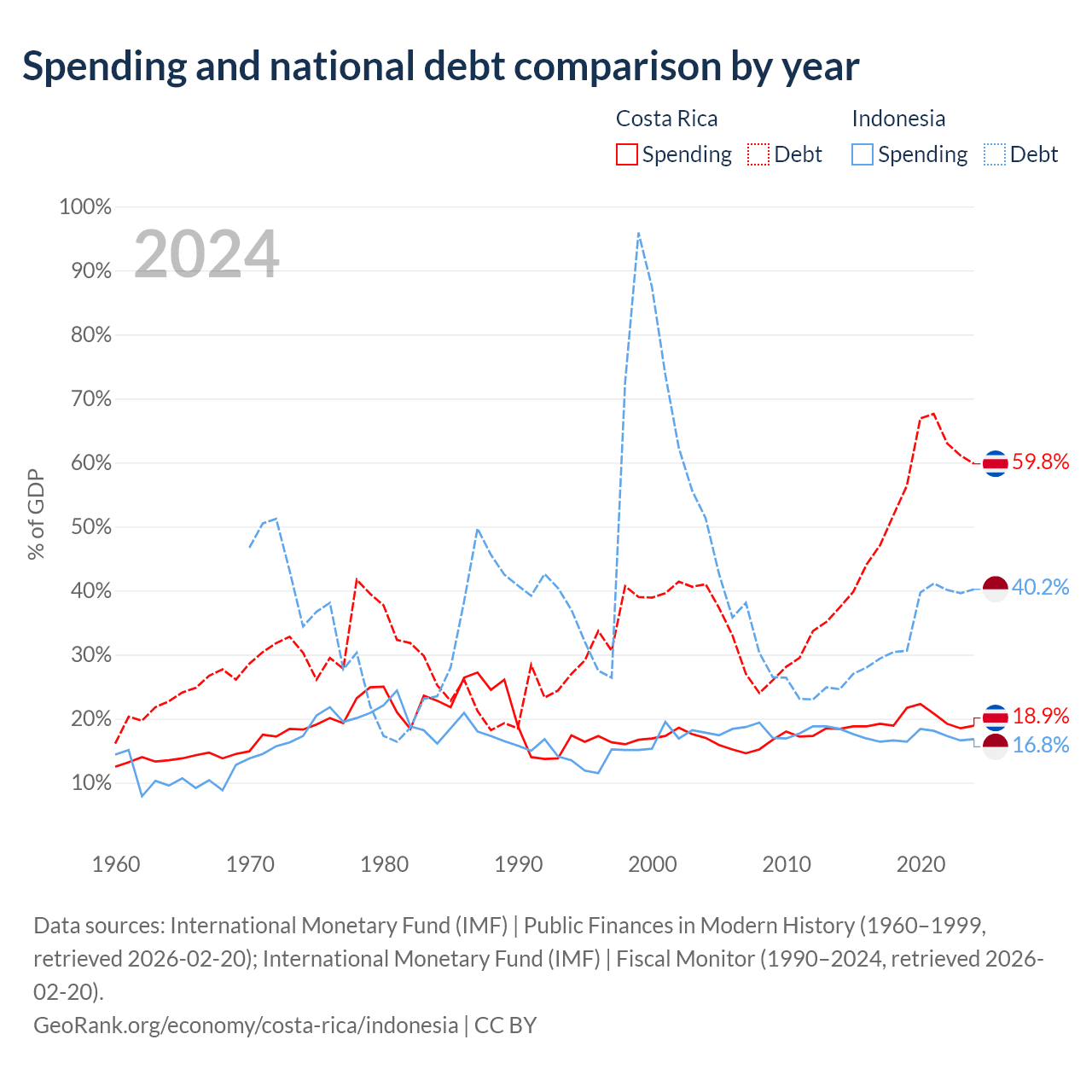 Costa Rica has $57B in government debt (59.8% of GDP), compared to $561B (40.2% of GDP) in Indonesia.