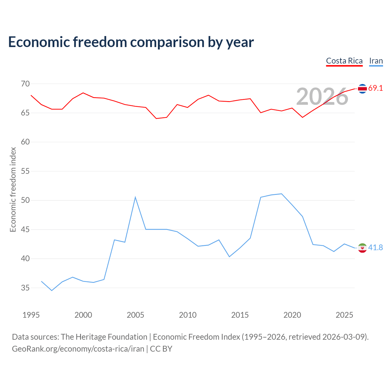 Data sources: The Heritage Foundation | Economic Freedom Index (1995–2026, retrieved 2026-03-09).