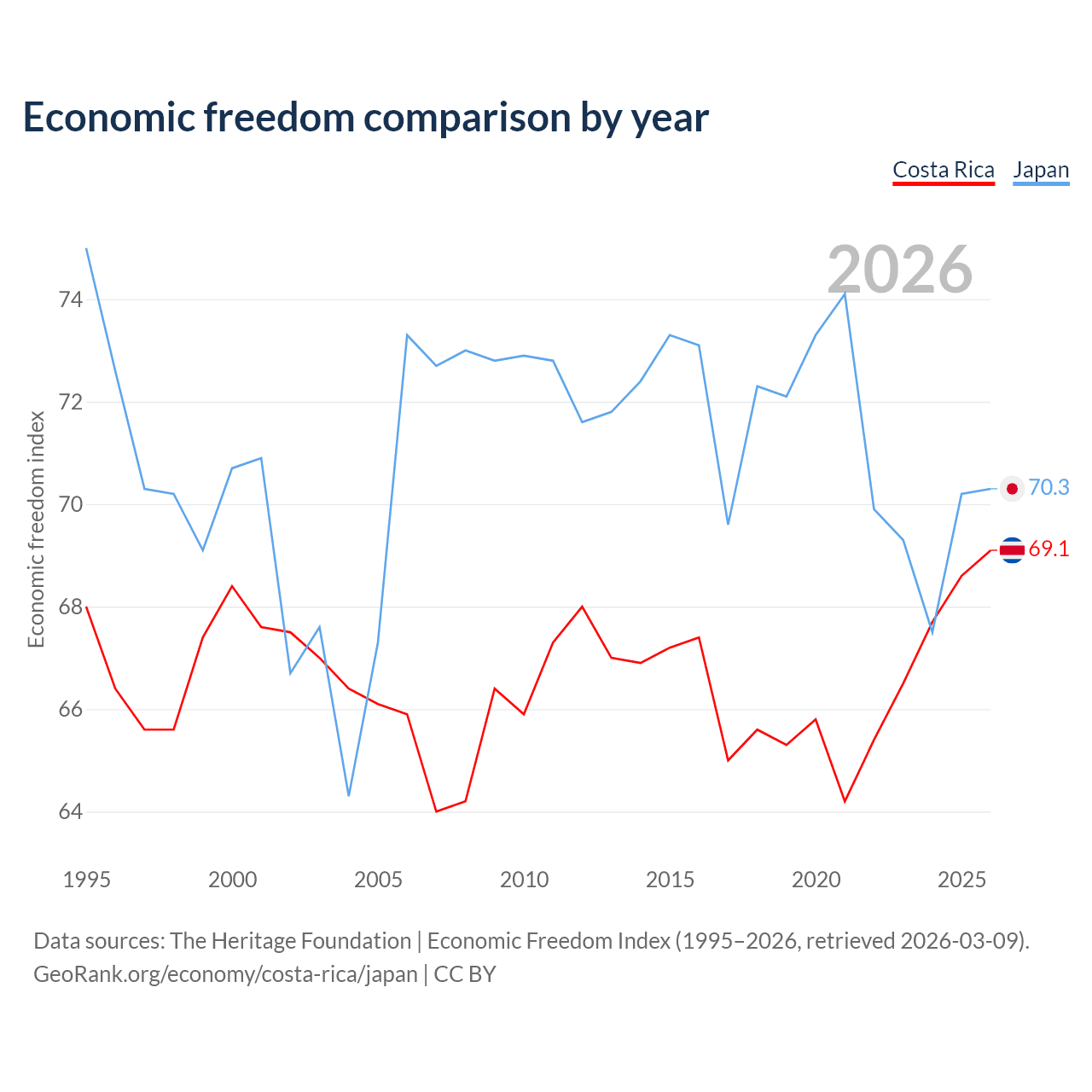 The Economic Freedom Index for Costa Rica is 69.1, ranking 43/197, compared to 70.3 for Japan, ranking 36/197. The chart above displays a comparison of annual changes in economic freedom indexes.