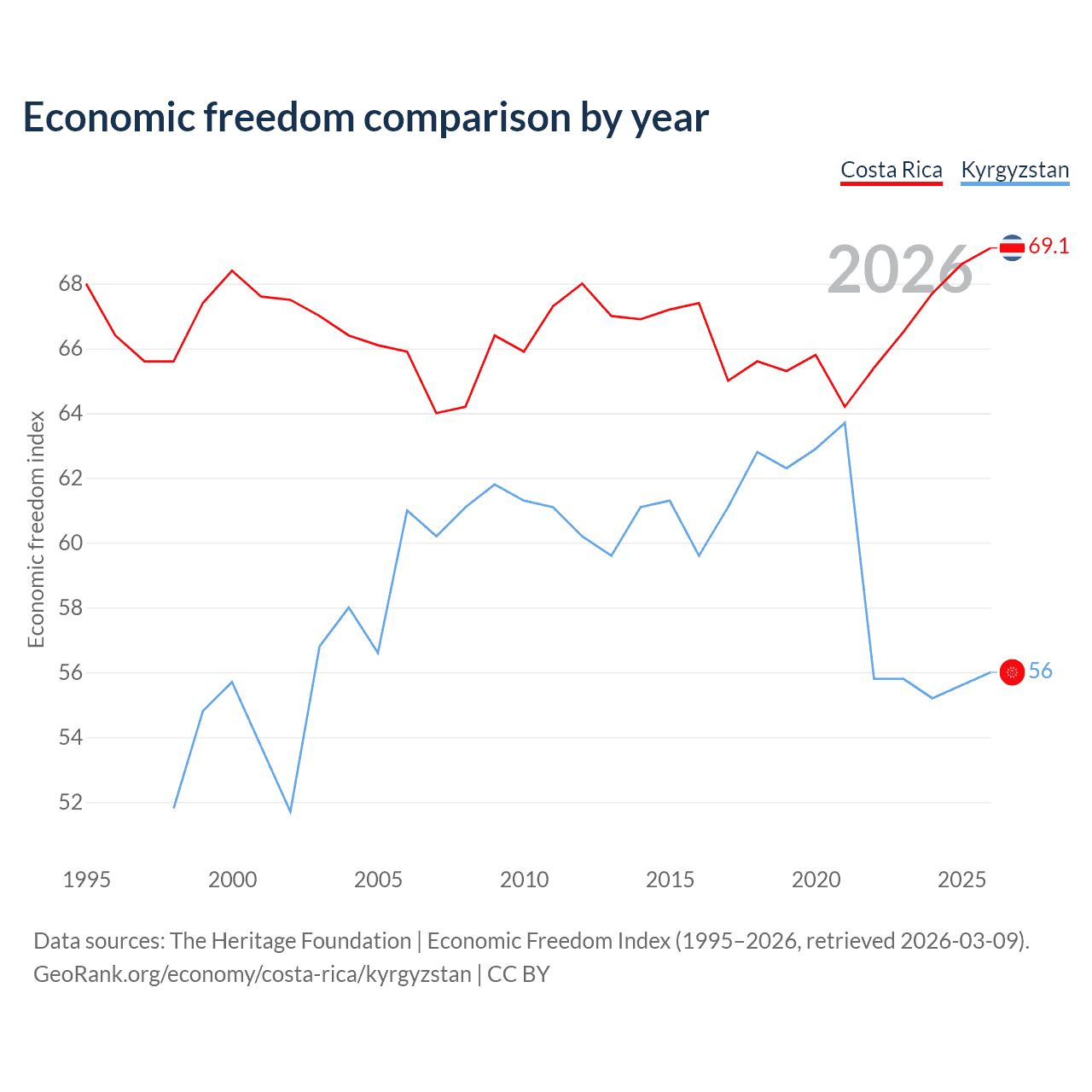 The Economic Freedom Index for Costa Rica is 69.1, ranking 43/197, compared to 56 for Kyrgyzstan, ranking 126/197. The chart above displays a comparison of annual changes in economic freedom indexes.