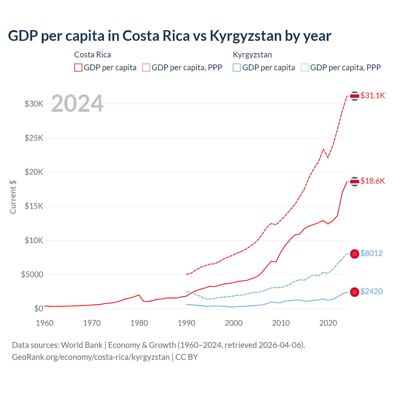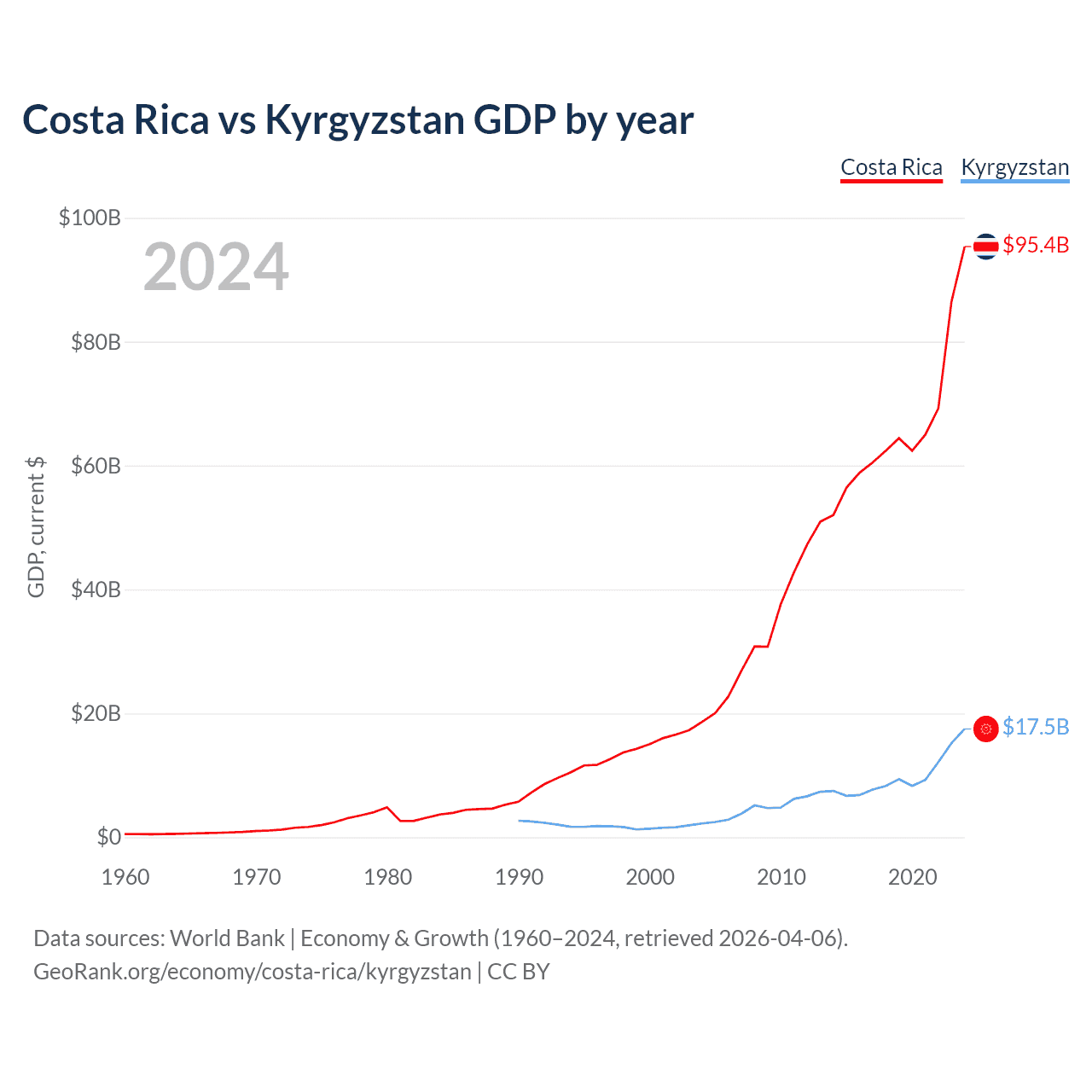 Costa Rica has a GDP of $95.4B compared to $17.5B for Kyrgyzstan, ranking 73/197 and 135/197 by economy size, respectively.
