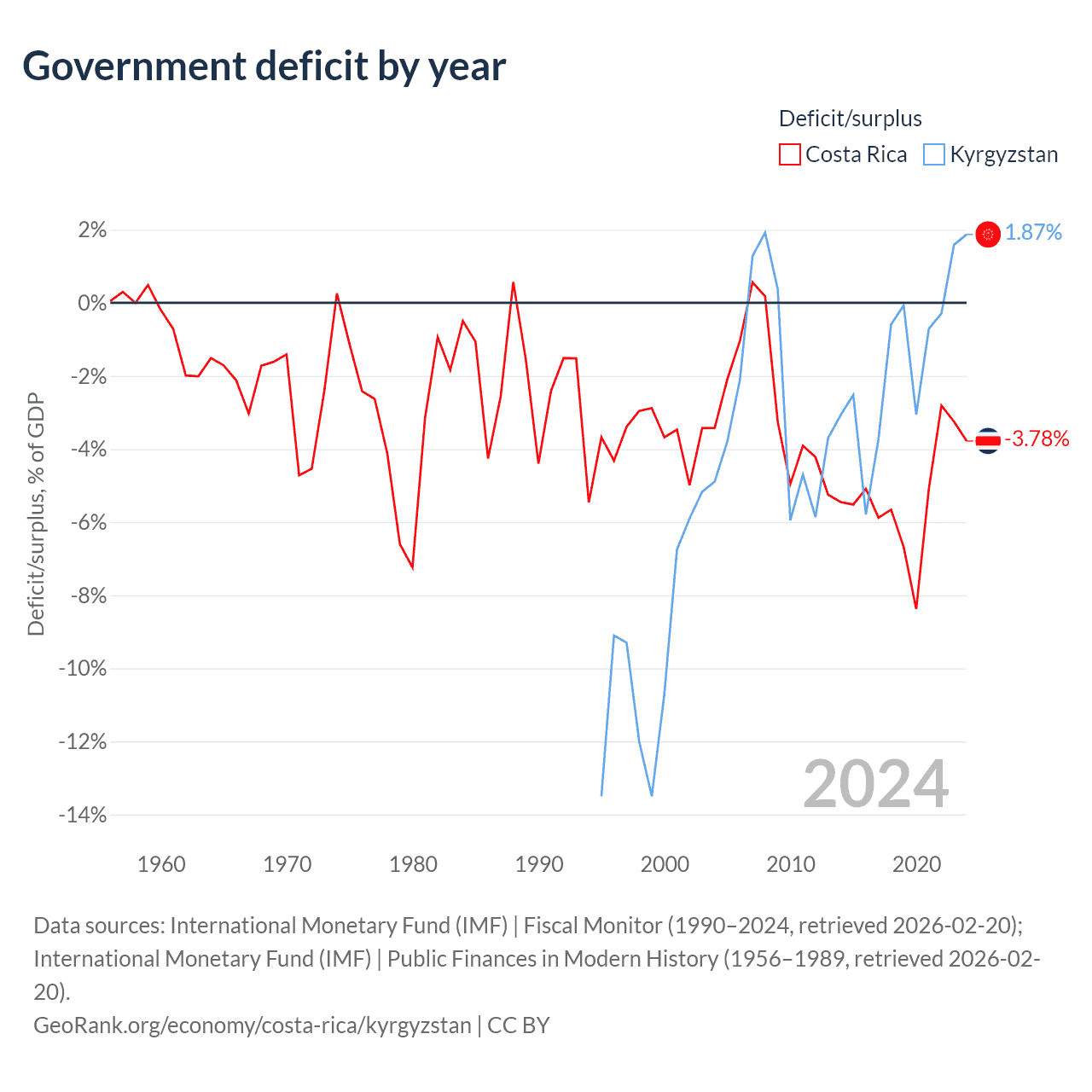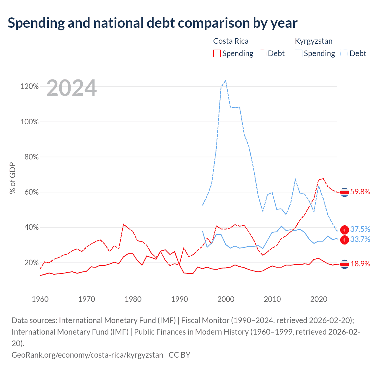 Costa Rica has $57B in government debt (59.8% of GDP), compared to $6.56B (37.5% of GDP) in Kyrgyzstan.