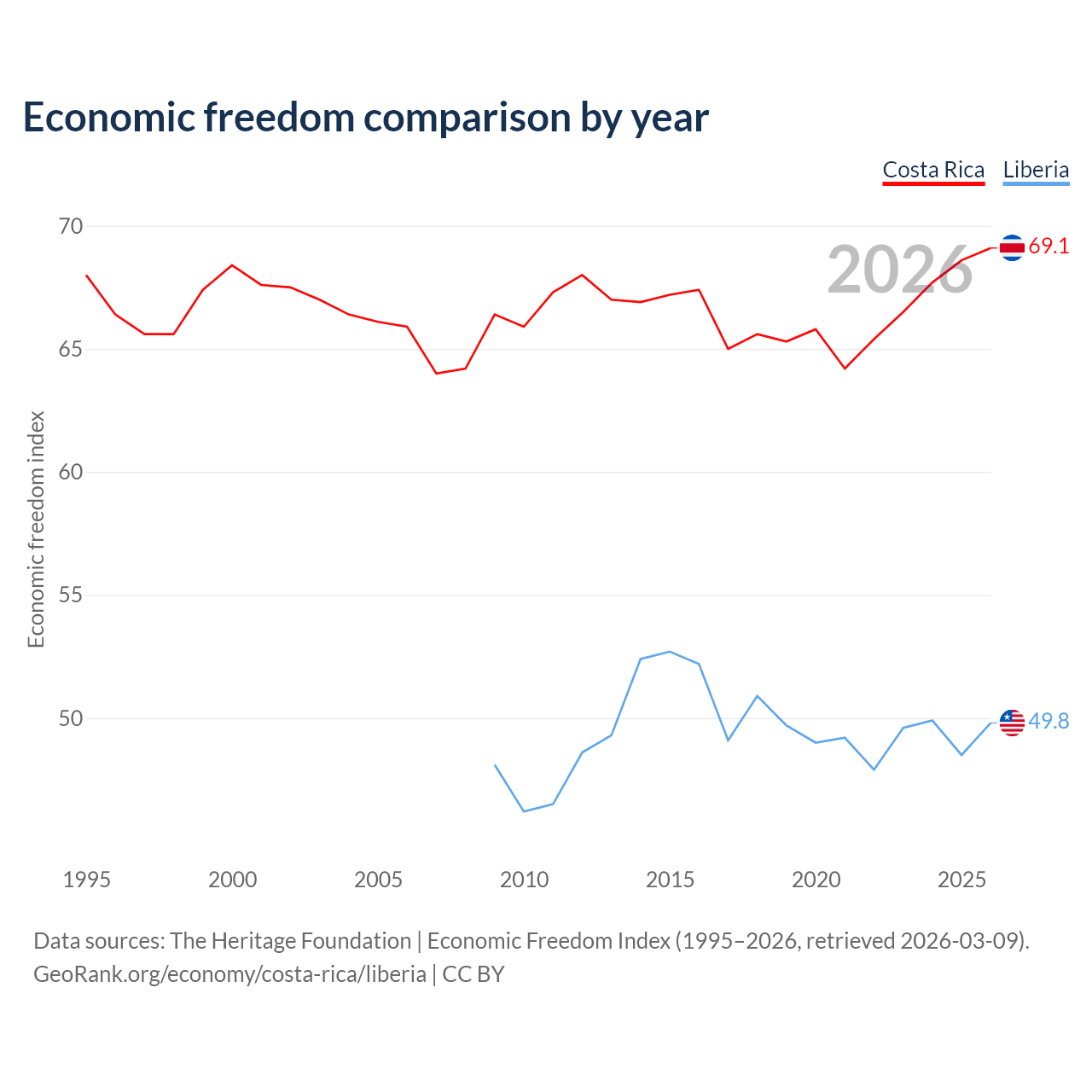 The Economic Freedom Index for Costa Rica is 69.1, ranking 43/197, compared to 49.8 for Liberia, ranking 163/197. The chart above displays a comparison of annual changes in economic freedom indexes.