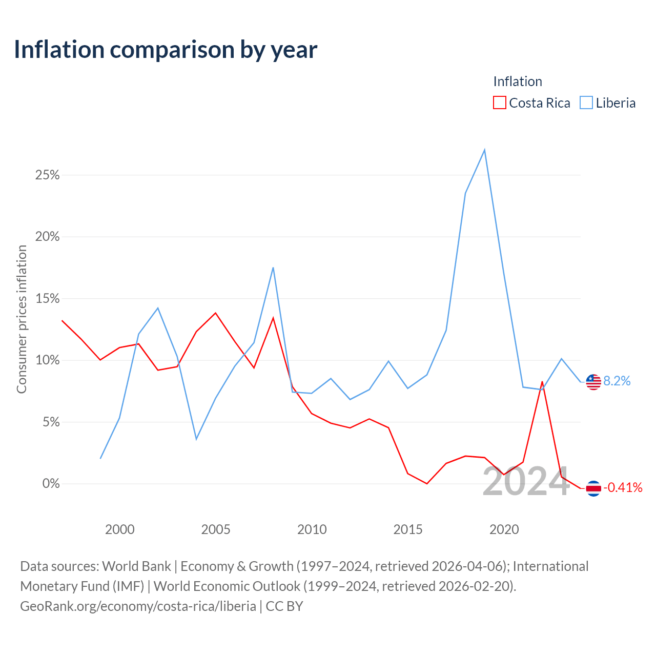 Costa Rica has a GDP of $95.4B compared to $4.78B for Liberia, ranking 73/197 and 163/197 by economy size, respectively.