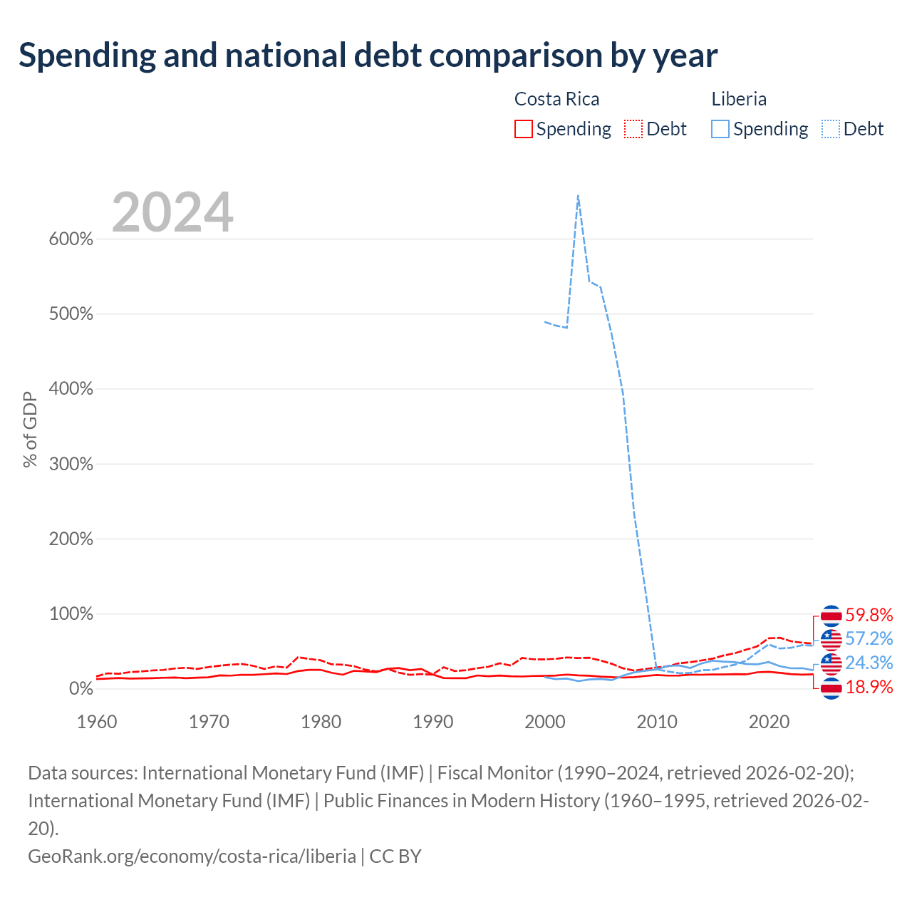 Costa Rica has $57B in government debt (59.8% of GDP), compared to $2.73B (57.2% of GDP) in Liberia.