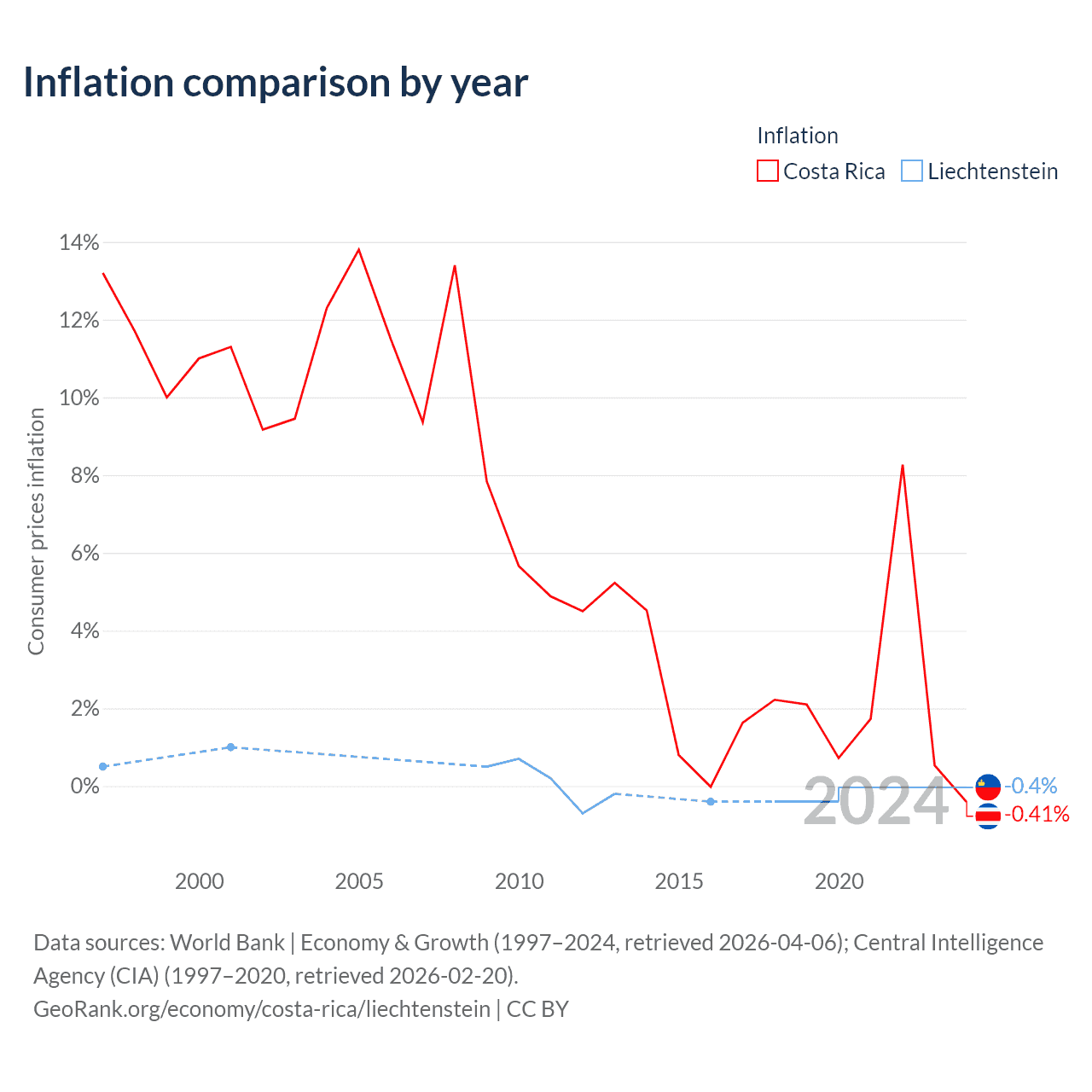 Over the past 24 years, Costa Rica has recorded an average annual inflation rate of 7.34%, compared with 0.04% in Liechtenstein. In 2020, inflation was -0.41% in Costa Rica and -0.4% in Liechtenstein.
