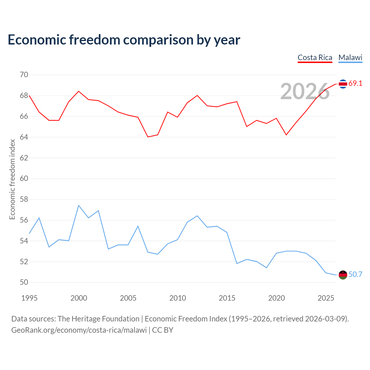 The Economic Freedom Index for Costa Rica is 69.1, ranking 43/197, compared to 50.7 for Malawi, ranking 159/197. The chart above displays a comparison of annual changes in economic freedom indexes.