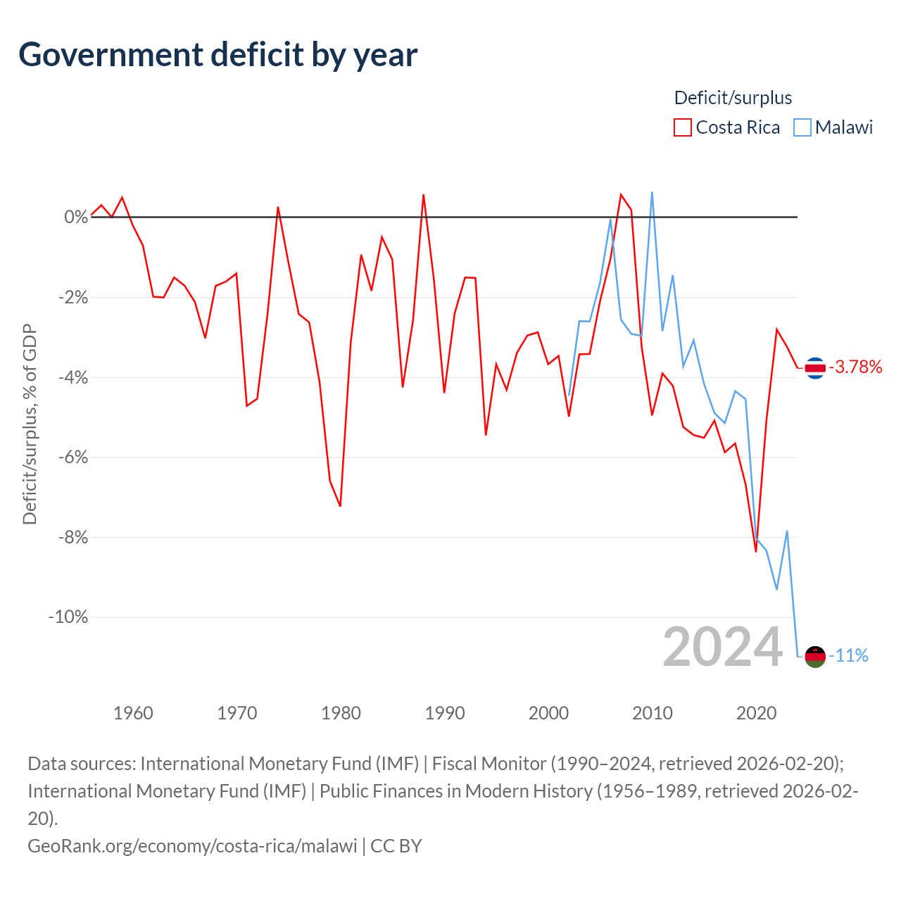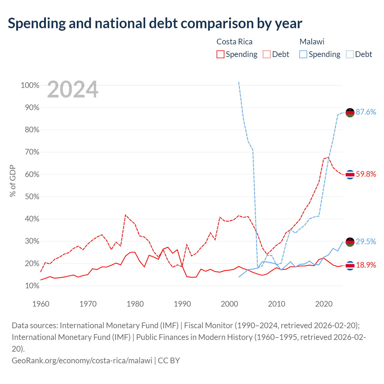 Costa Rica has $57B in government debt (59.8% of GDP), compared to $9.91B (87.6% of GDP) in Malawi.