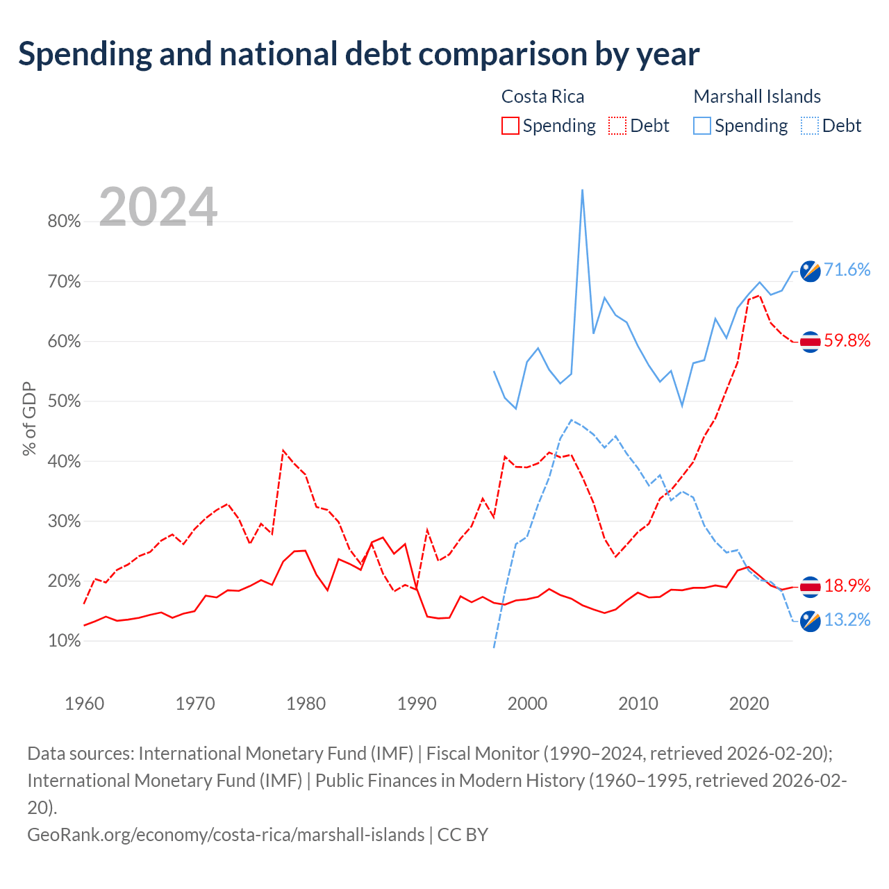 Costa Rica has $57B in government debt (59.8% of GDP), compared to $38.4M (13.2% of GDP) in the Marshall Islands.
