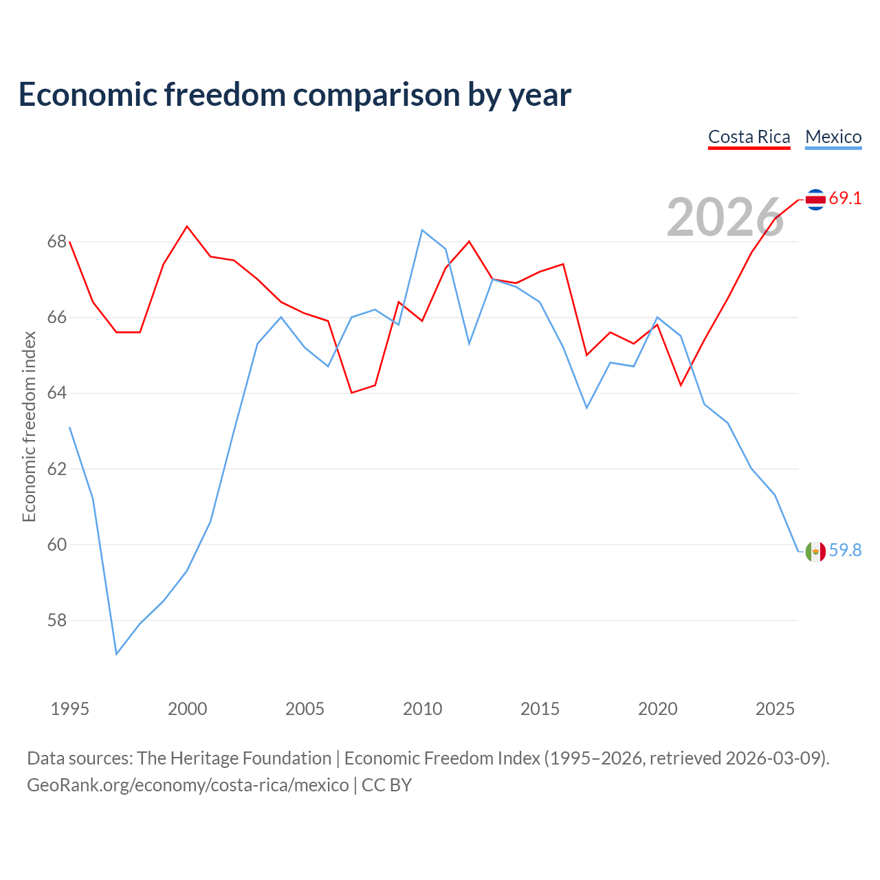 Data sources: The Heritage Foundation | Economic Freedom Index (1995–2026, retrieved 2026-03-09).