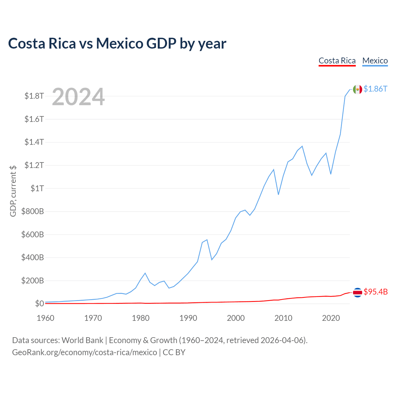 Costa Rica vs Mexico GDP by year