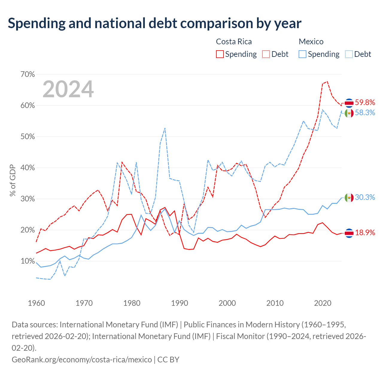 Costa Rica has $57B in government debt (59.8% of GDP), compared to $1.08T (58.3% of GDP) in Mexico.