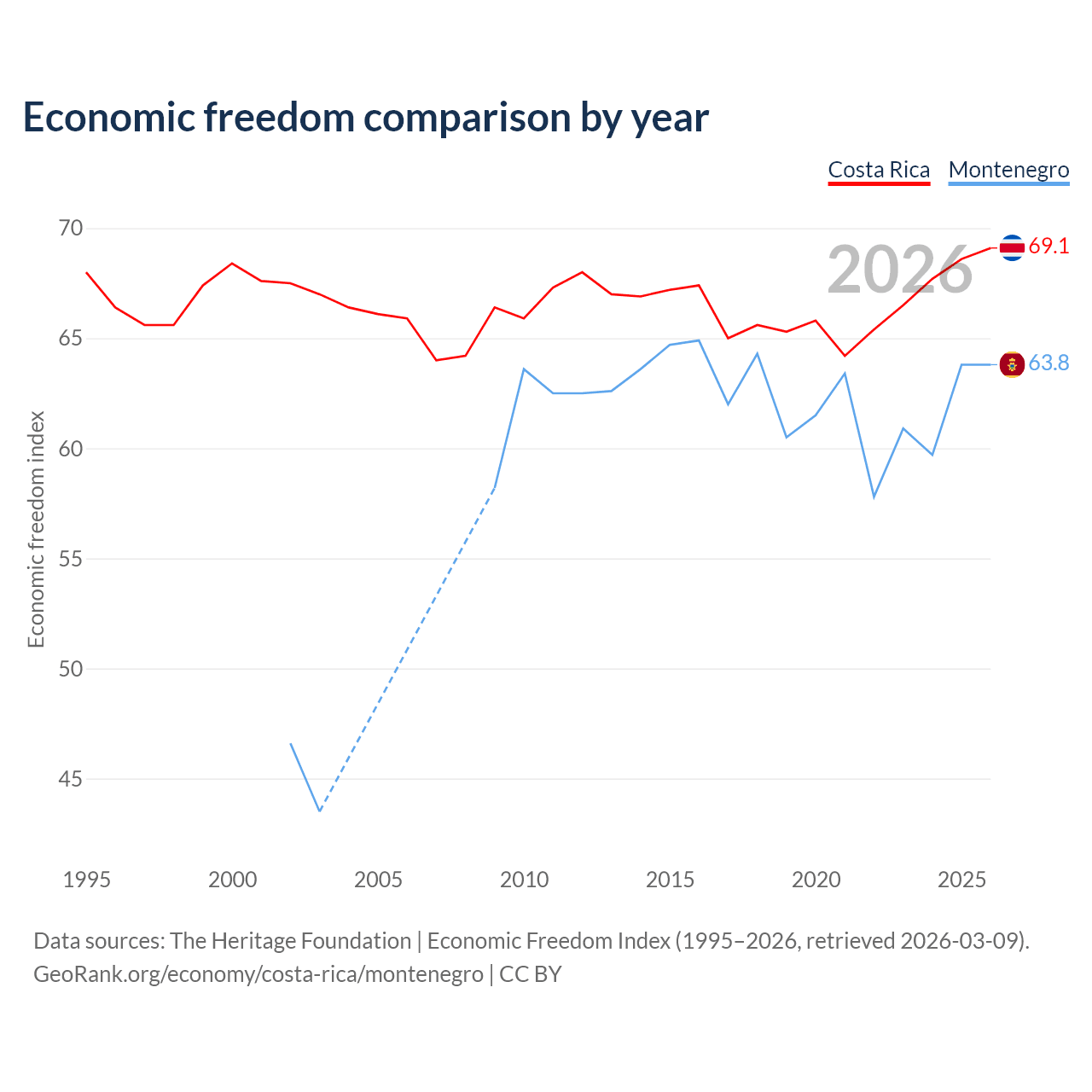 The Economic Freedom Index for Costa Rica is 69.1, ranking 43/197, compared to 63.8 for Montenegro, ranking 78/197. The chart above displays a comparison of annual changes in economic freedom indexes.