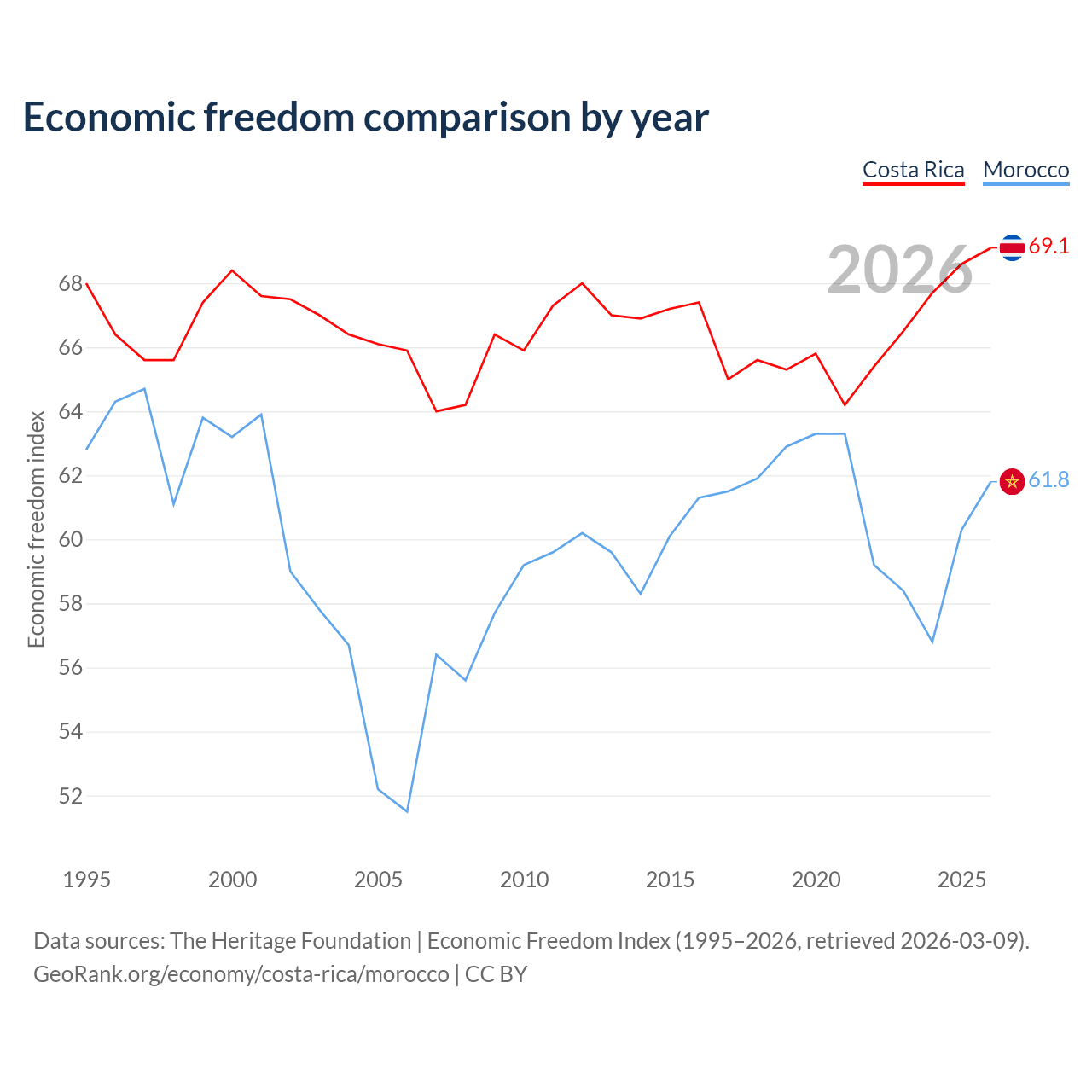 The Economic Freedom Index for Costa Rica is 69.1, ranking 43/197, compared to 61.8 for Morocco, ranking 91/197. The chart above displays a comparison of annual changes in economic freedom indexes.
