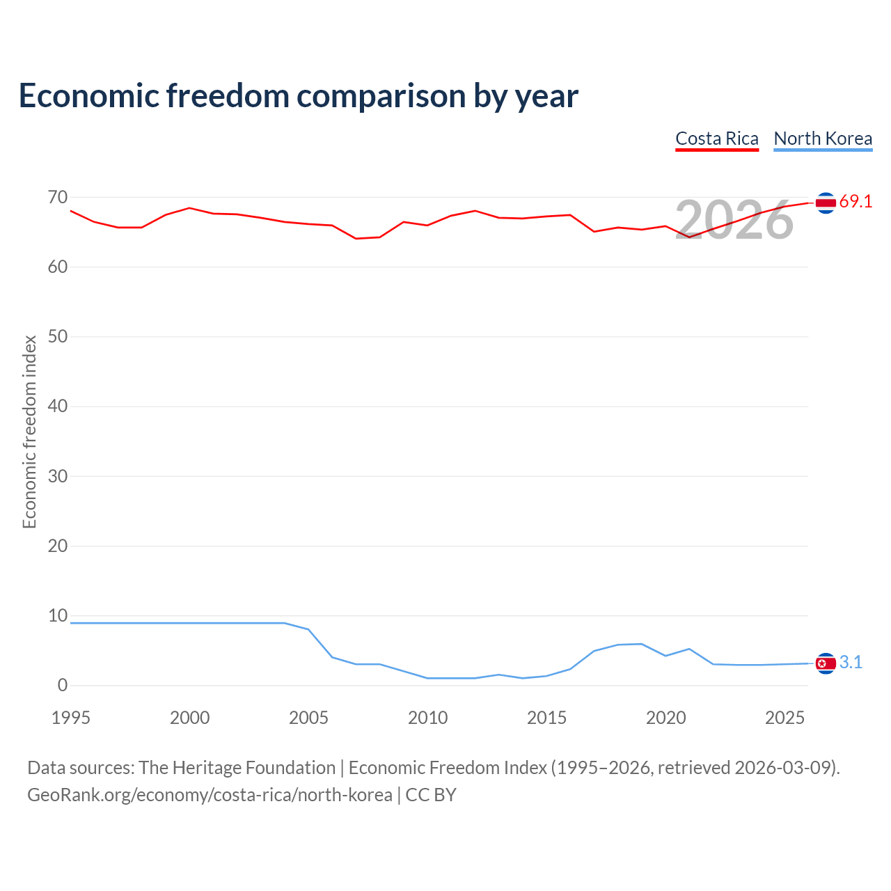 The Economic Freedom Index for Costa Rica is 69.1, ranking 43/197, compared to 3.1 for North Korea, ranking 197/197. The chart above displays a comparison of annual changes in economic freedom indexes.