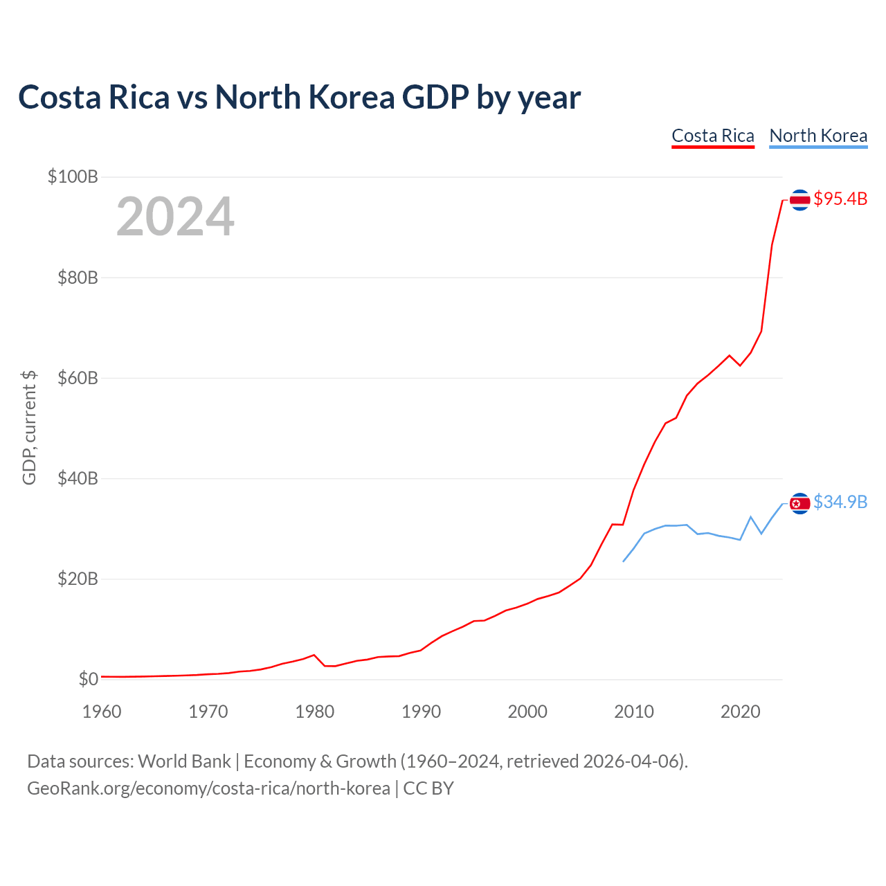 Costa Rica has a GDP of $95.4B compared to $34.9B for North Korea, ranking 73/197 and 106/197 by economy size, respectively.
