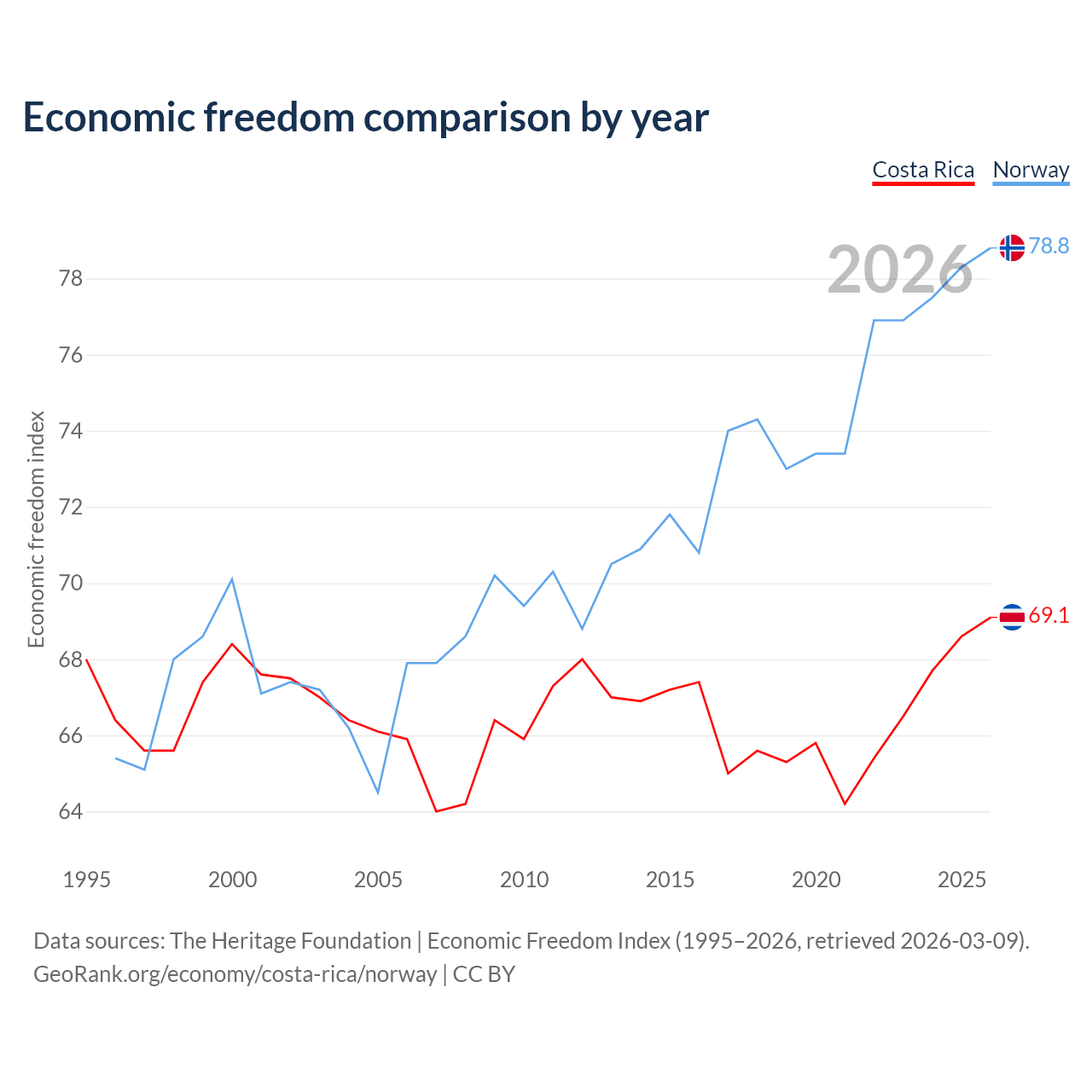 The Economic Freedom Index for Costa Rica is 69.1, ranking 43/197, compared to 78.8 for Norway, ranking 9/197. The chart above displays a comparison of annual changes in economic freedom indexes.