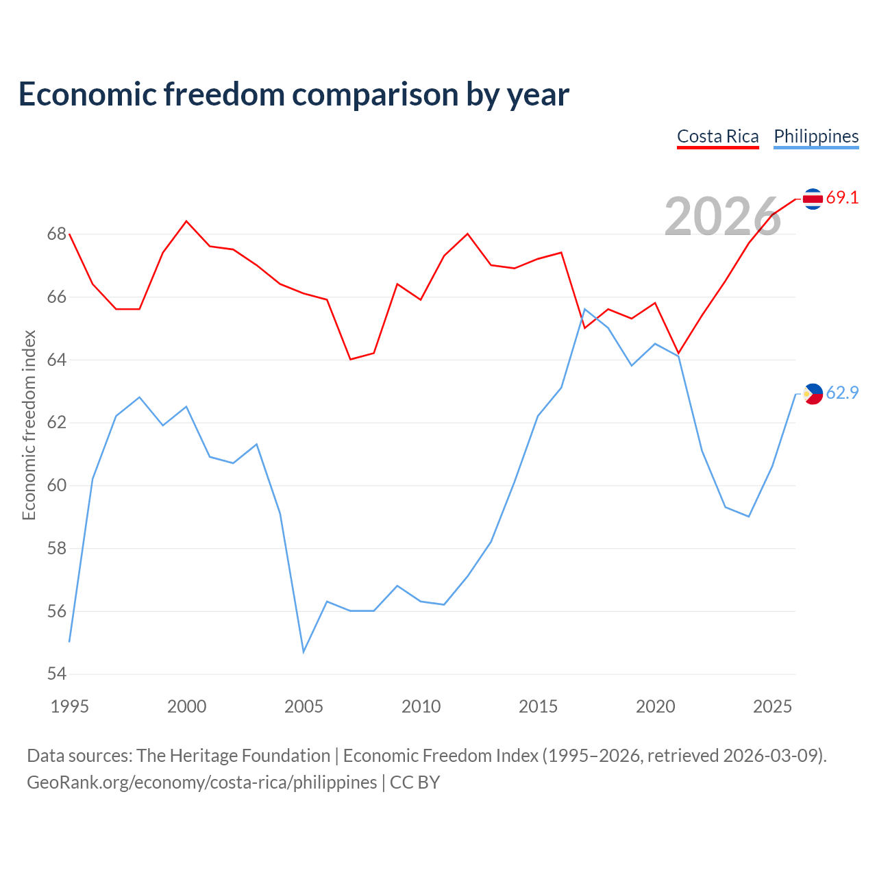 The Economic Freedom Index for Costa Rica is 69.1, ranking 43/197, compared to 62.9 for the Philippines, ranking 85/197. The chart above displays a comparison of annual changes in economic freedom indexes.