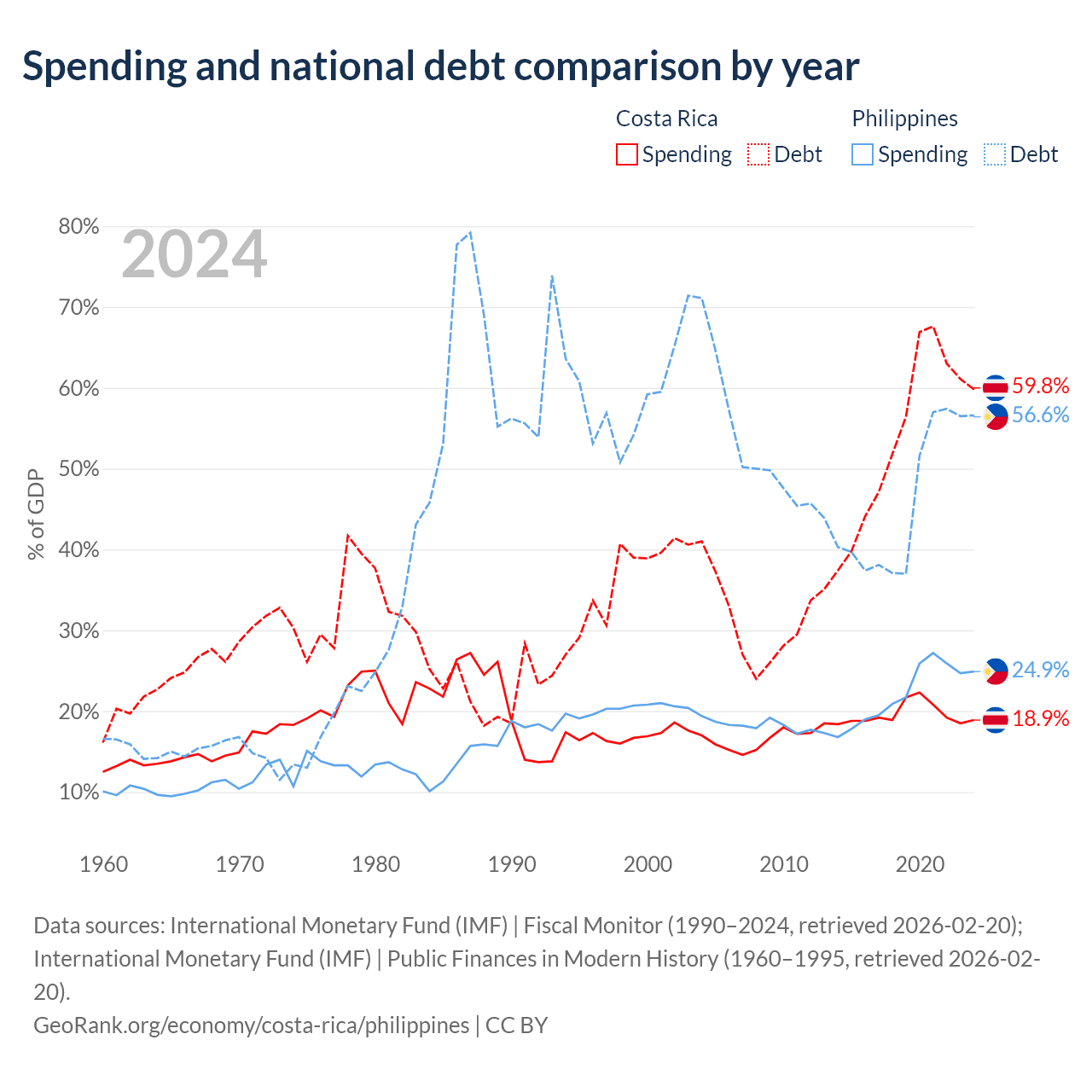 Costa Rica has $57B in government debt (59.8% of GDP), compared to $261B (56.6% of GDP) in the Philippines.
