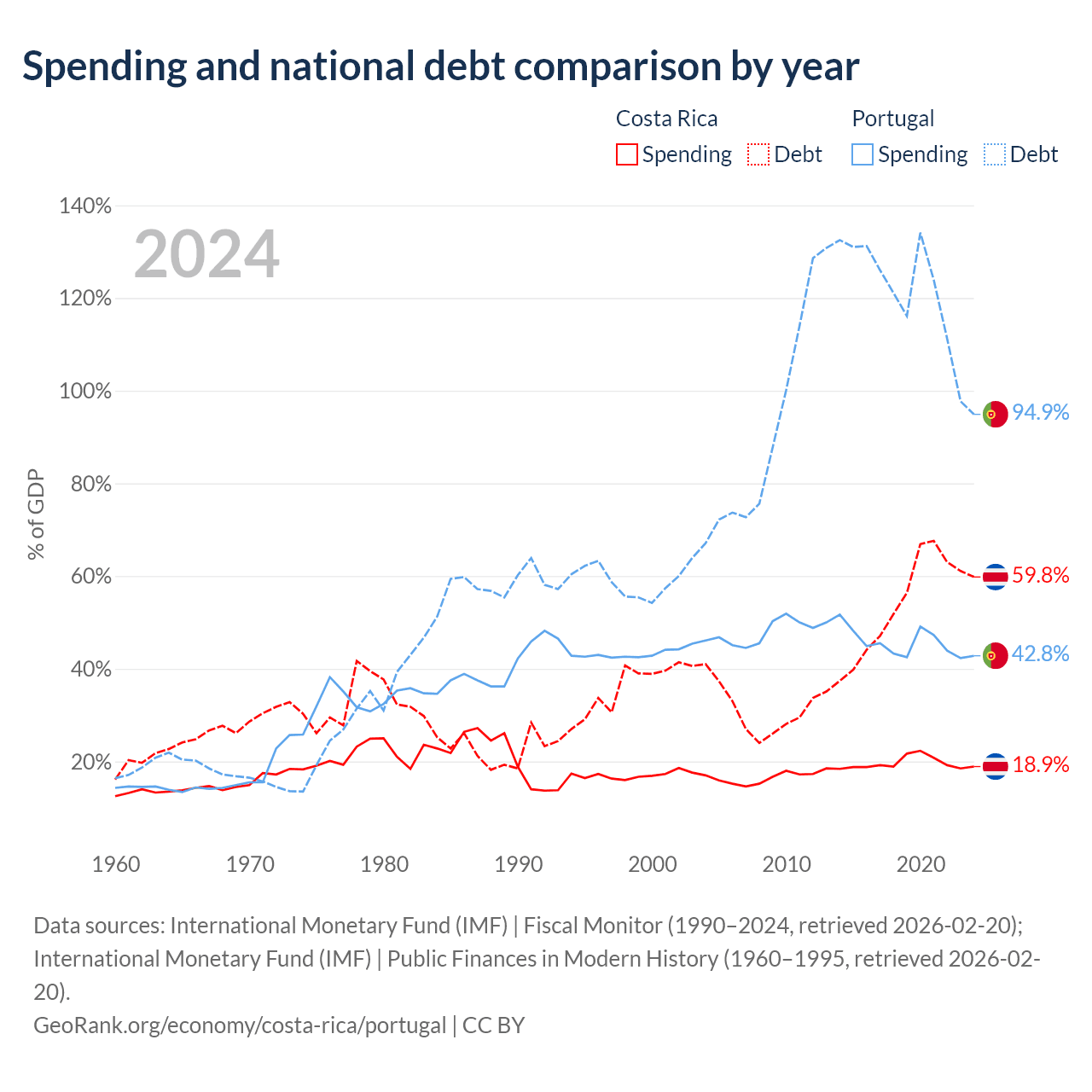 Costa Rica has $57B in government debt (59.8% of GDP), compared to $297B (94.9% of GDP) in Portugal.