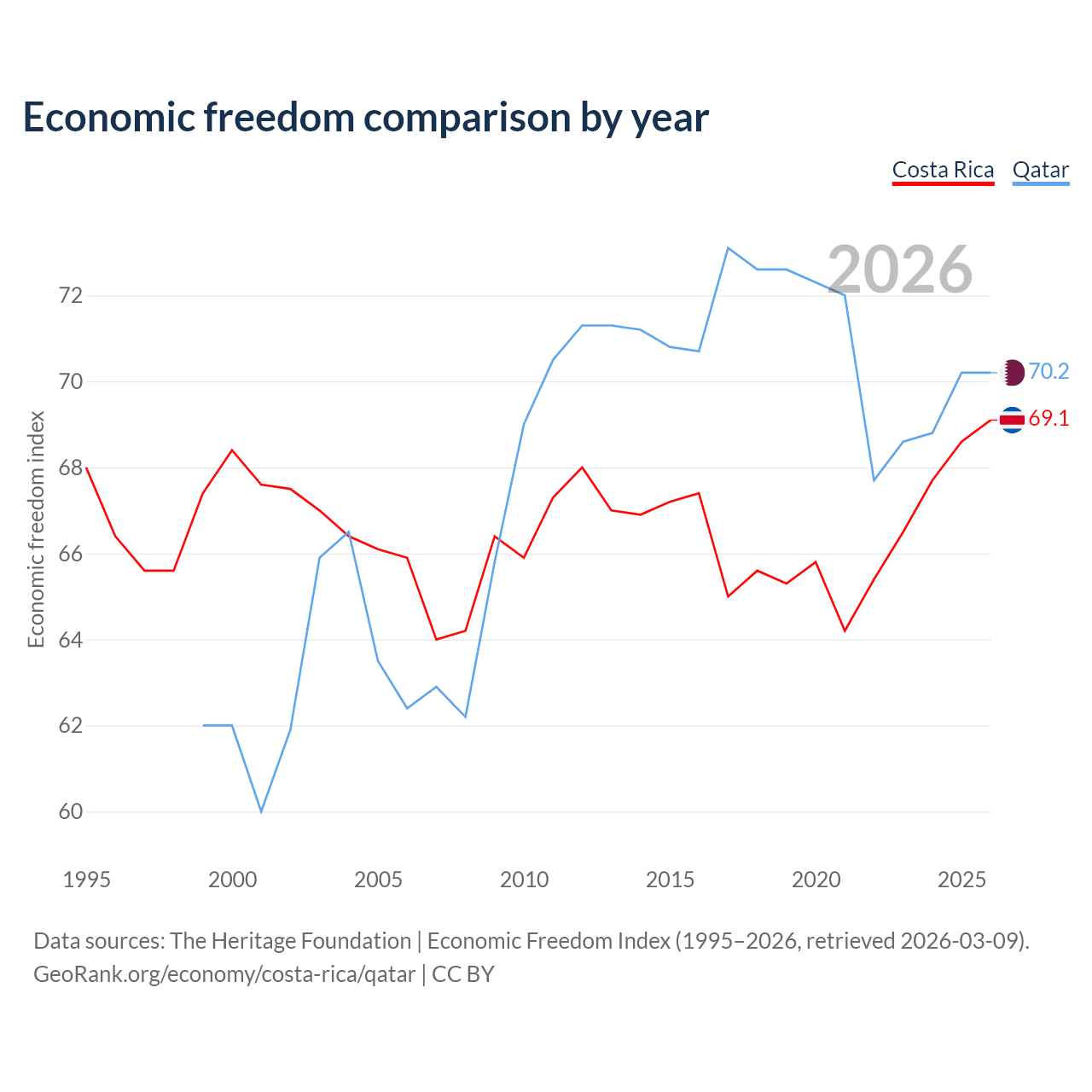 The Economic Freedom Index for Costa Rica is 69.1, ranking 43/197, compared to 70.2 for Qatar, ranking 37/197. The chart above displays a comparison of annual changes in economic freedom indexes.