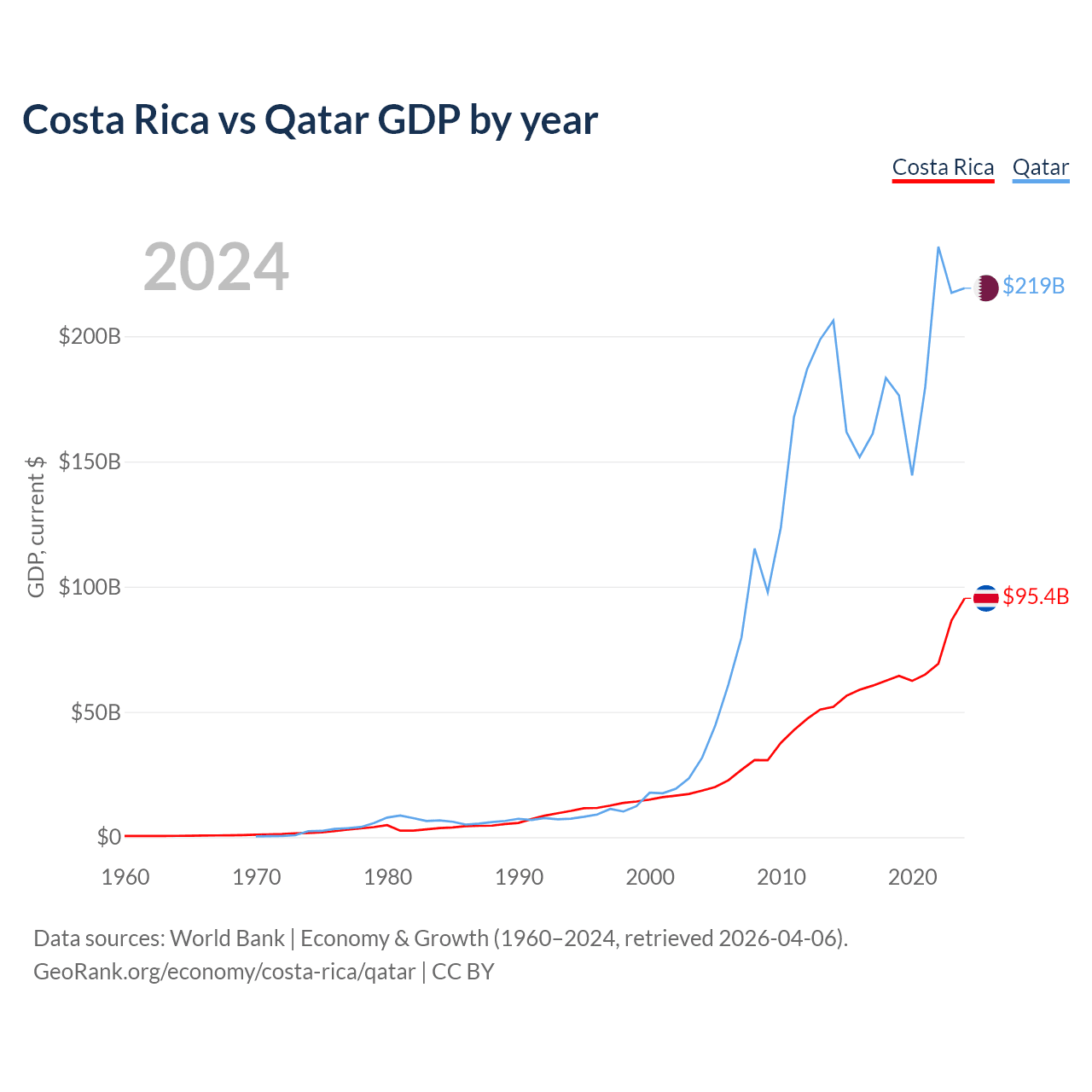 Costa Rica has a GDP of $95.4B compared to $219B for Qatar, ranking 73/197 and 56/197 by economy size, respectively.
