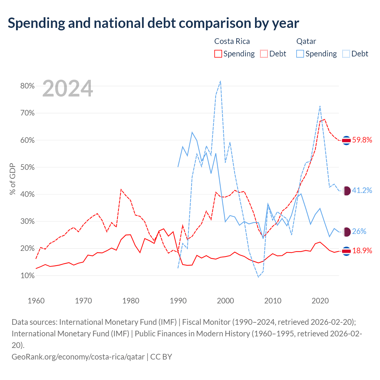 Costa Rica has $57B in government debt (59.8% of GDP), compared to $90.2B (41.2% of GDP) in Qatar.