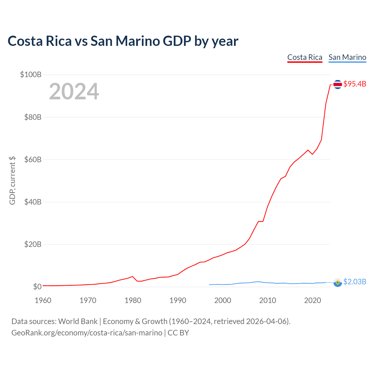 Costa Rica has a GDP of $95.4B compared to $2.03B for San Marino, ranking 73/197 and 180/197 by economy size, respectively.