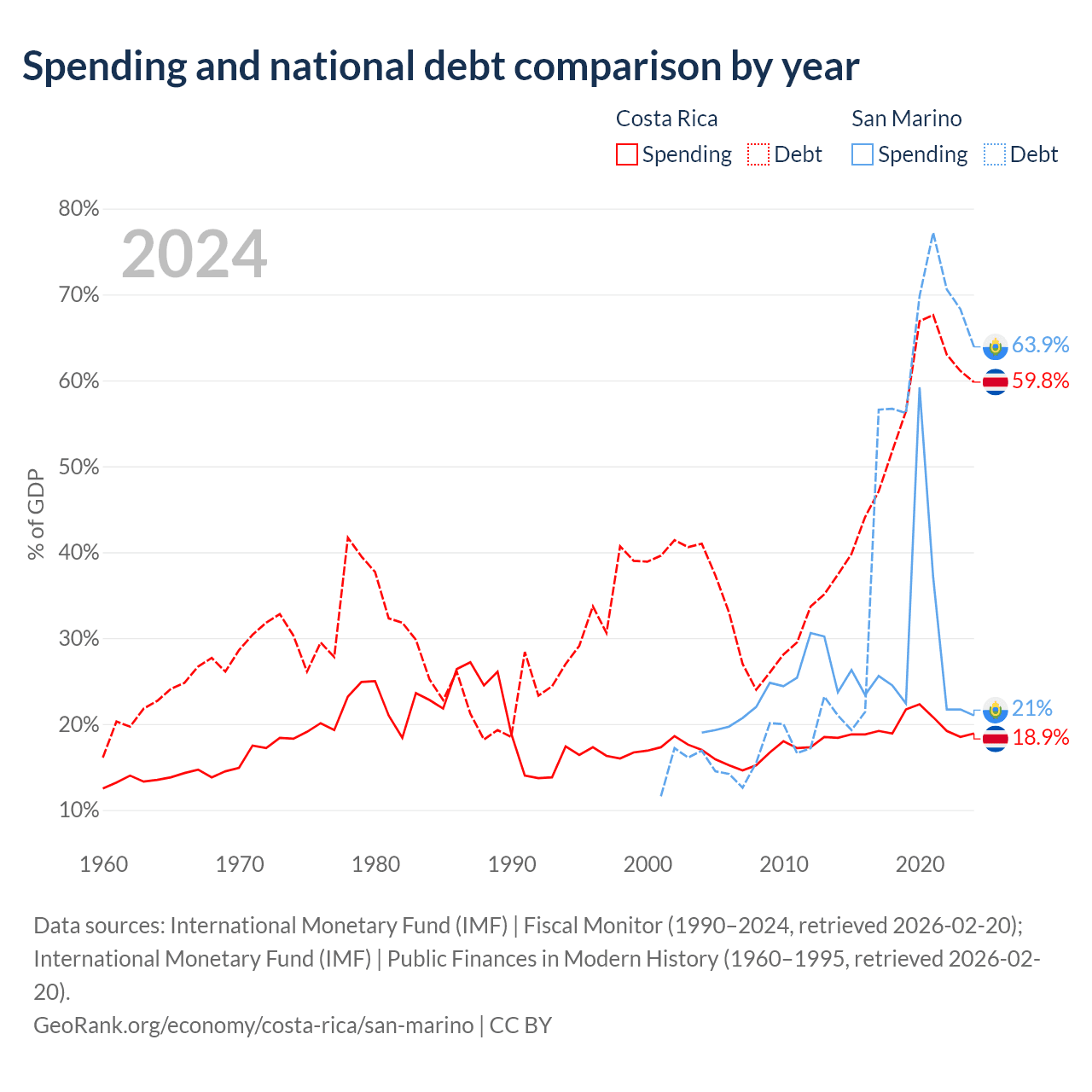Costa Rica has $57B in government debt (59.8% of GDP), compared to $1.39B (63.9% of GDP) in San Marino.