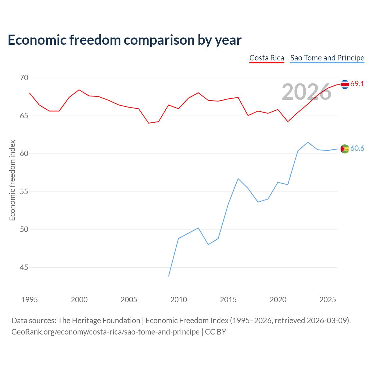 The Economic Freedom Index for Costa Rica is 69.1, ranking 43/197, compared to 60.6 for Sao Tome and Principe, ranking 93/197. The chart above displays a comparison of annual changes in economic freedom indexes.