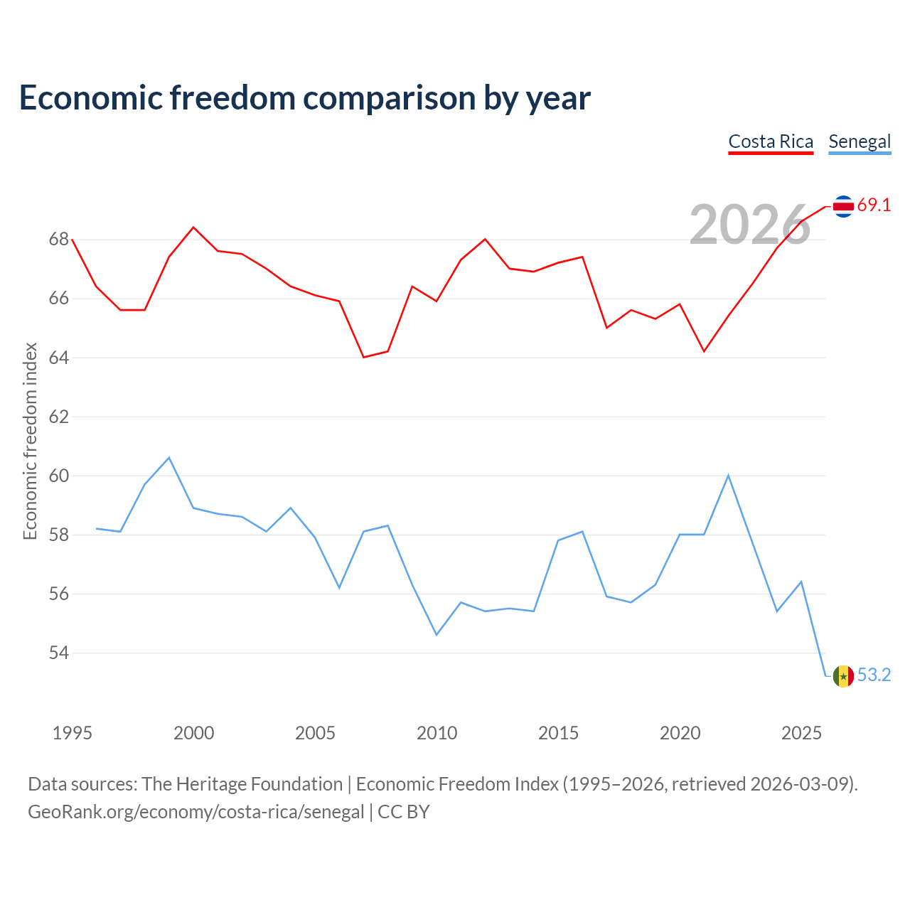 The Economic Freedom Index for Costa Rica is 69.1, ranking 43/197, compared to 53.2 for Senegal, ranking 140/197. The chart above displays a comparison of annual changes in economic freedom indexes.