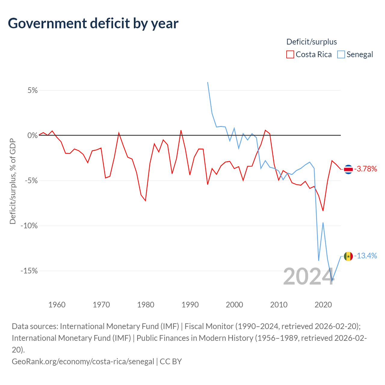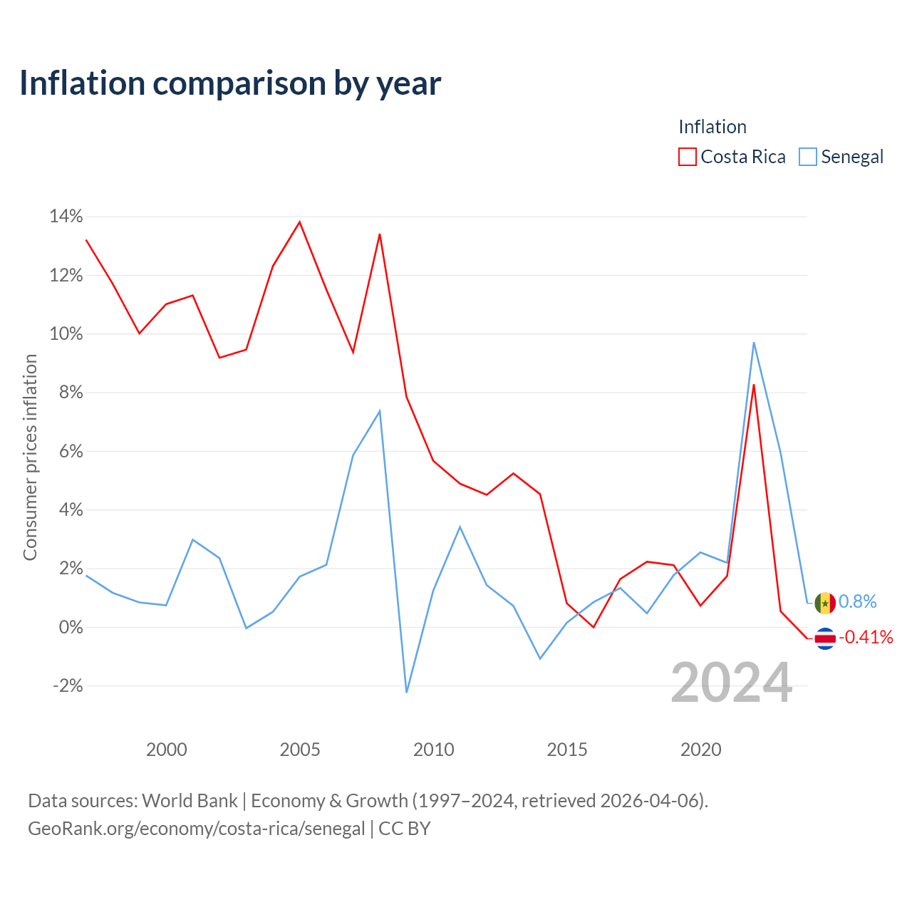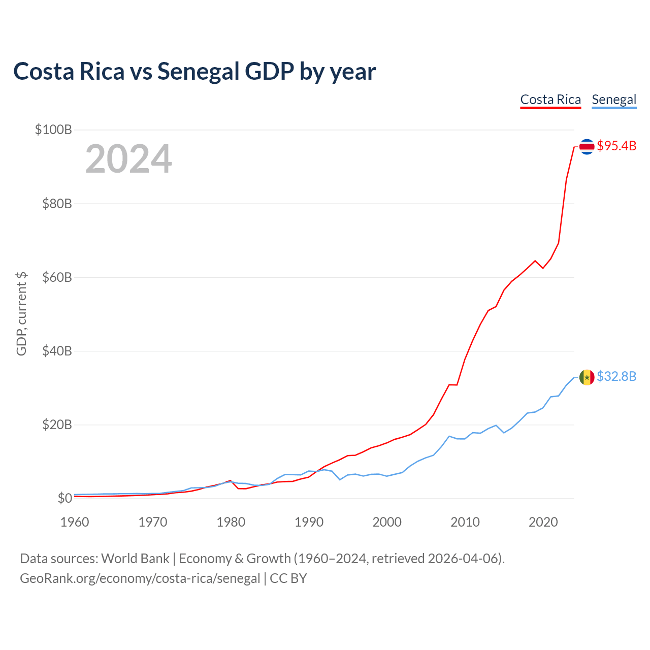 Costa Rica has a GDP of $95.4B compared to $32.8B for Senegal, ranking 73/197 and 109/197 by economy size, respectively.