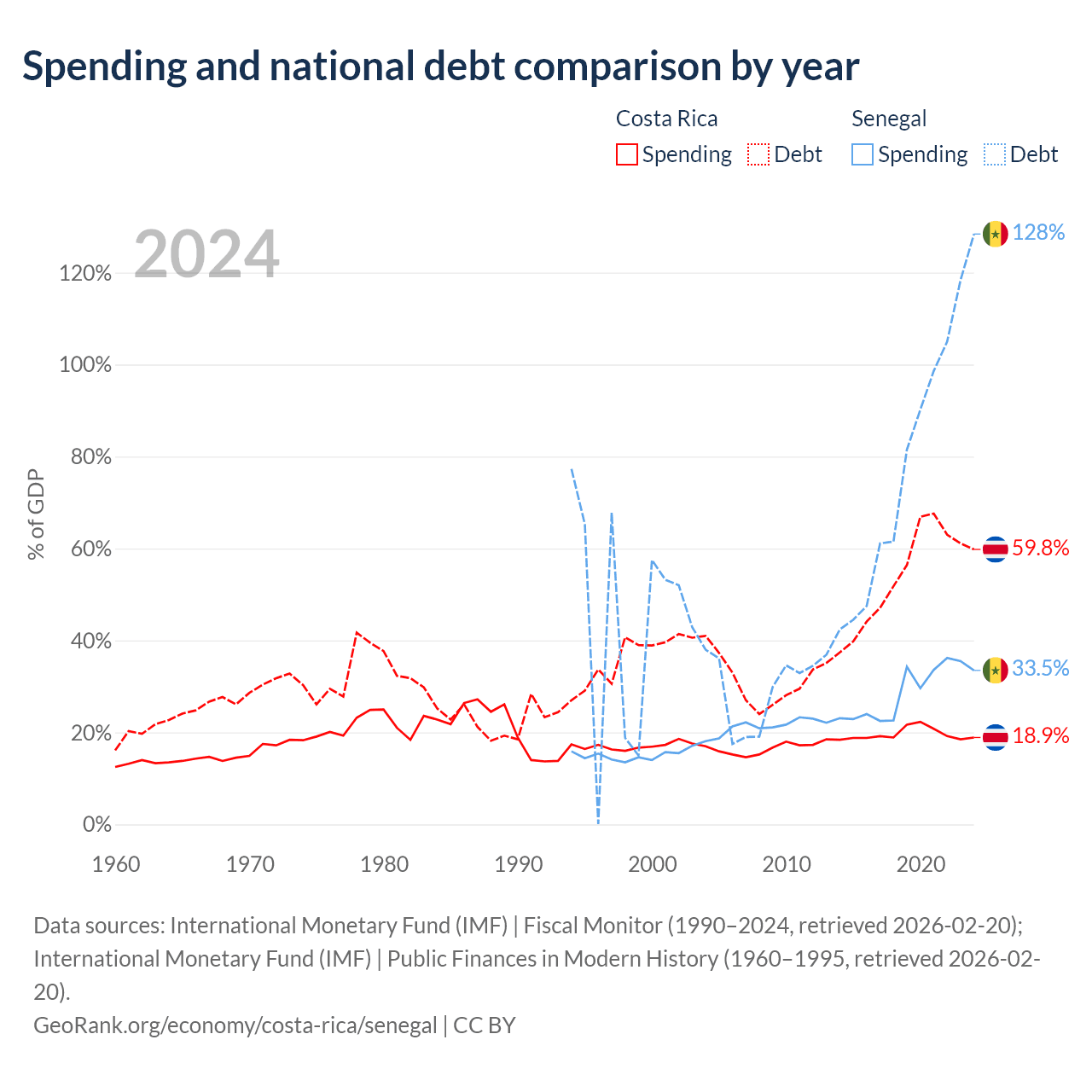 Costa Rica has $57B in government debt (59.8% of GDP), compared to $42.1B (128.4% of GDP) in Senegal.