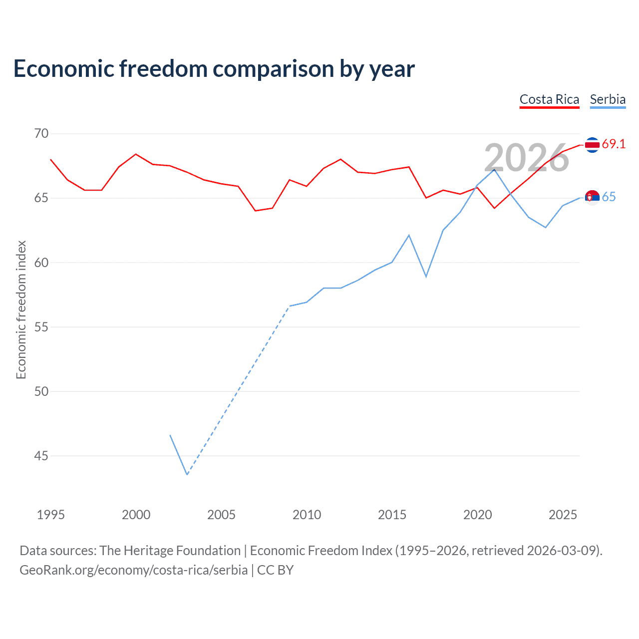 The Economic Freedom Index for Costa Rica is 69.1, ranking 43/197, compared to 65 for Serbia, ranking 68/197. The chart above displays a comparison of annual changes in economic freedom indexes.
