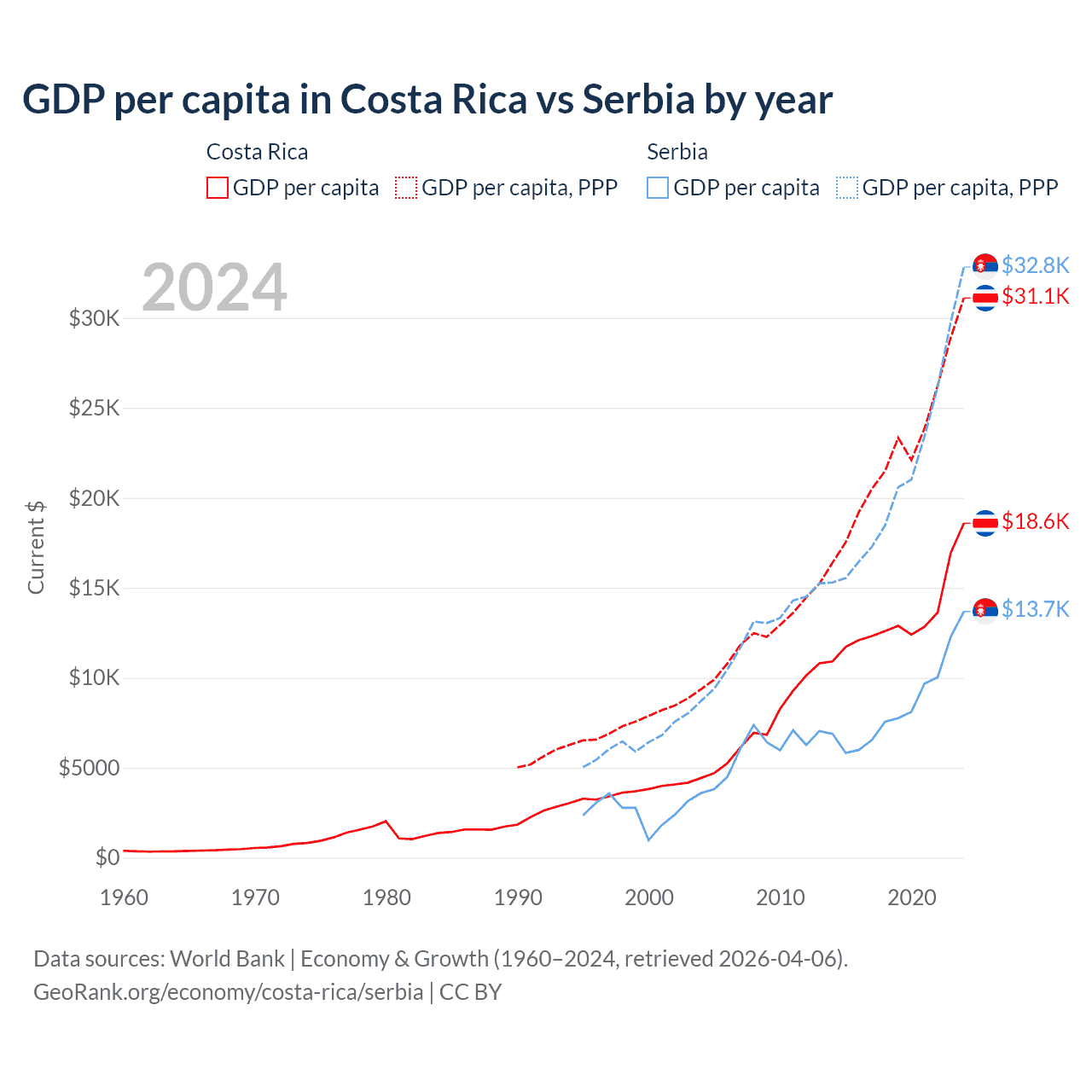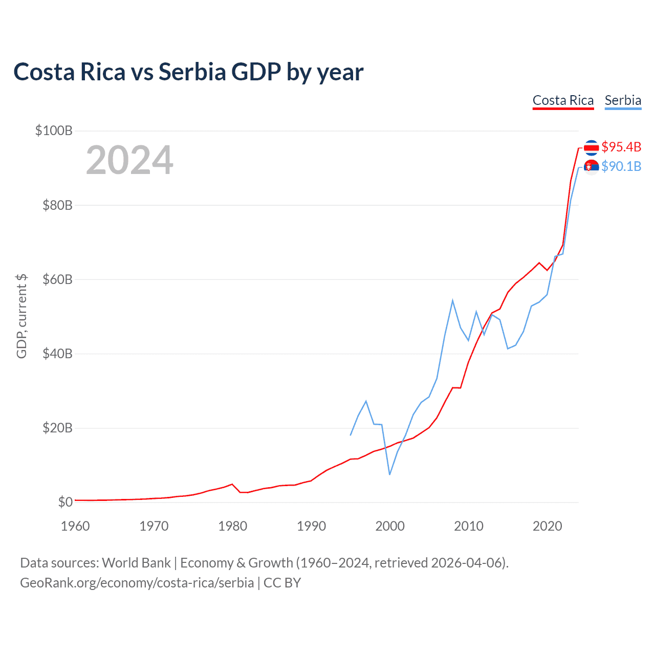 Costa Rica has a GDP of $95.4B compared to $90.1B for Serbia, ranking 73/197 and 76/197 by economy size, respectively.