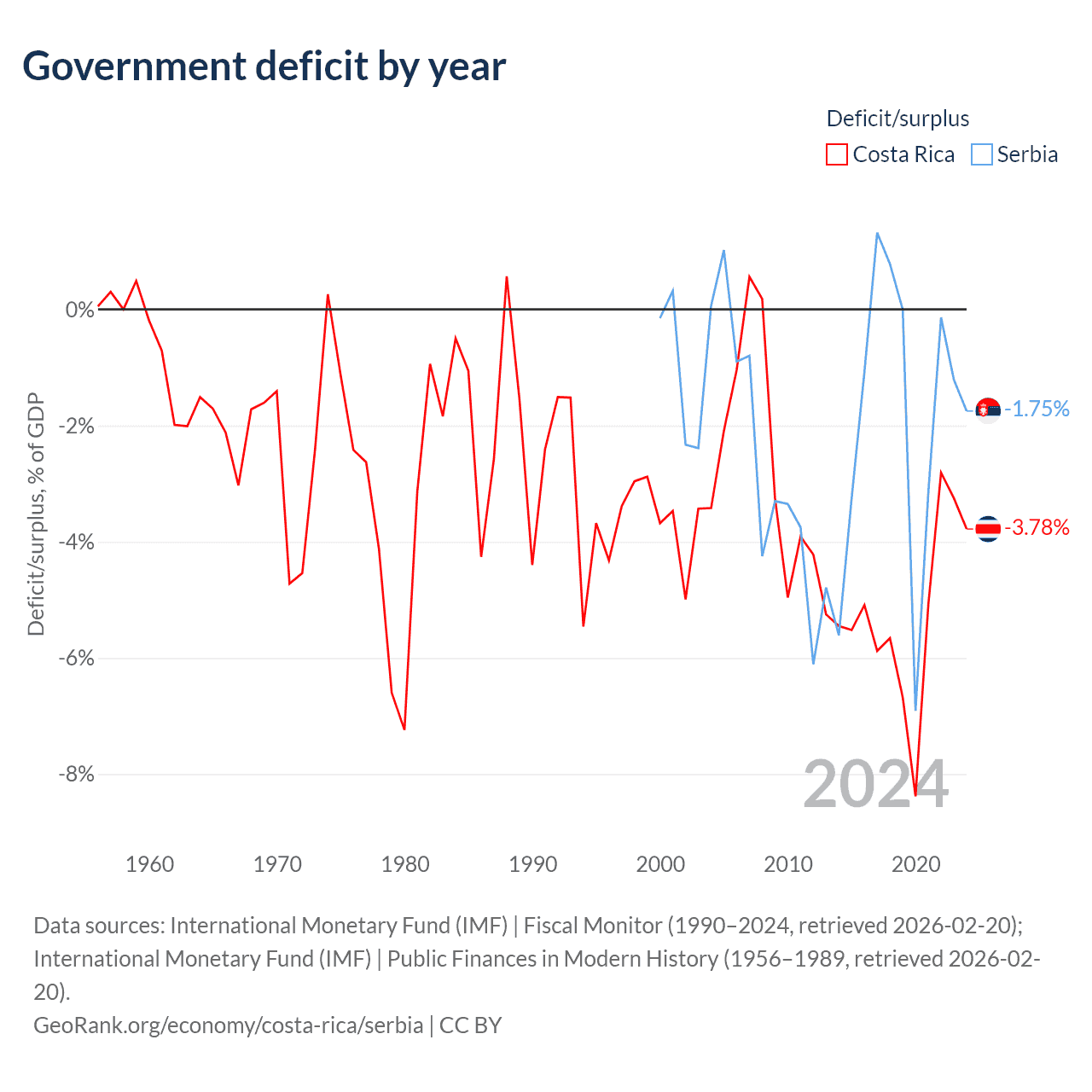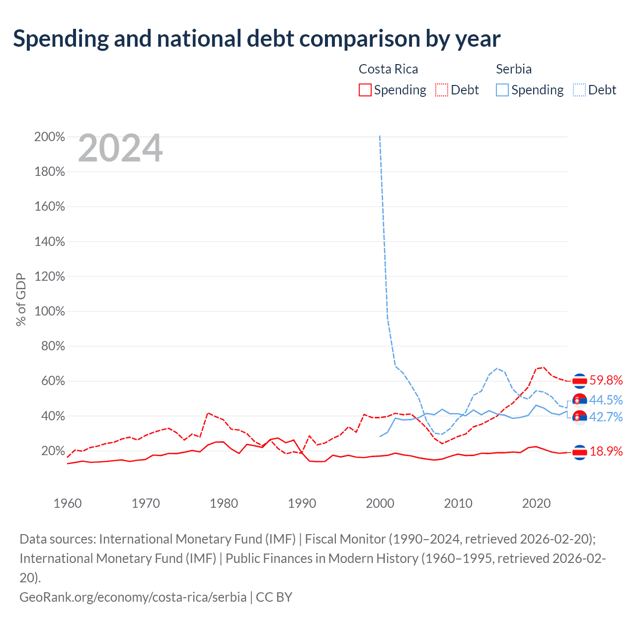 Costa Rica has $57B in government debt (59.8% of GDP), compared to $40.1B (44.5% of GDP) in Serbia.