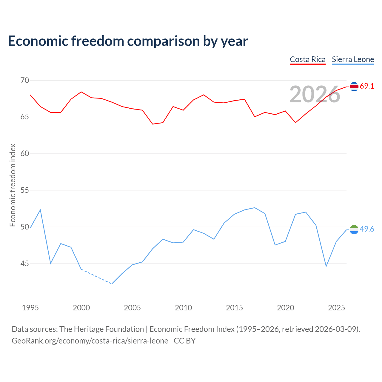 The Economic Freedom Index for Costa Rica is 69.1, ranking 43/197, compared to 49.6 for Sierra Leone, ranking 165/197. The chart above displays a comparison of annual changes in economic freedom indexes.