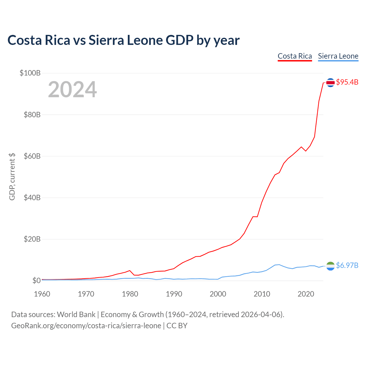 Costa Rica has a GDP of $95.4B compared to $6.97B for Sierra Leone, ranking 73/197 and 160/197 by economy size, respectively.